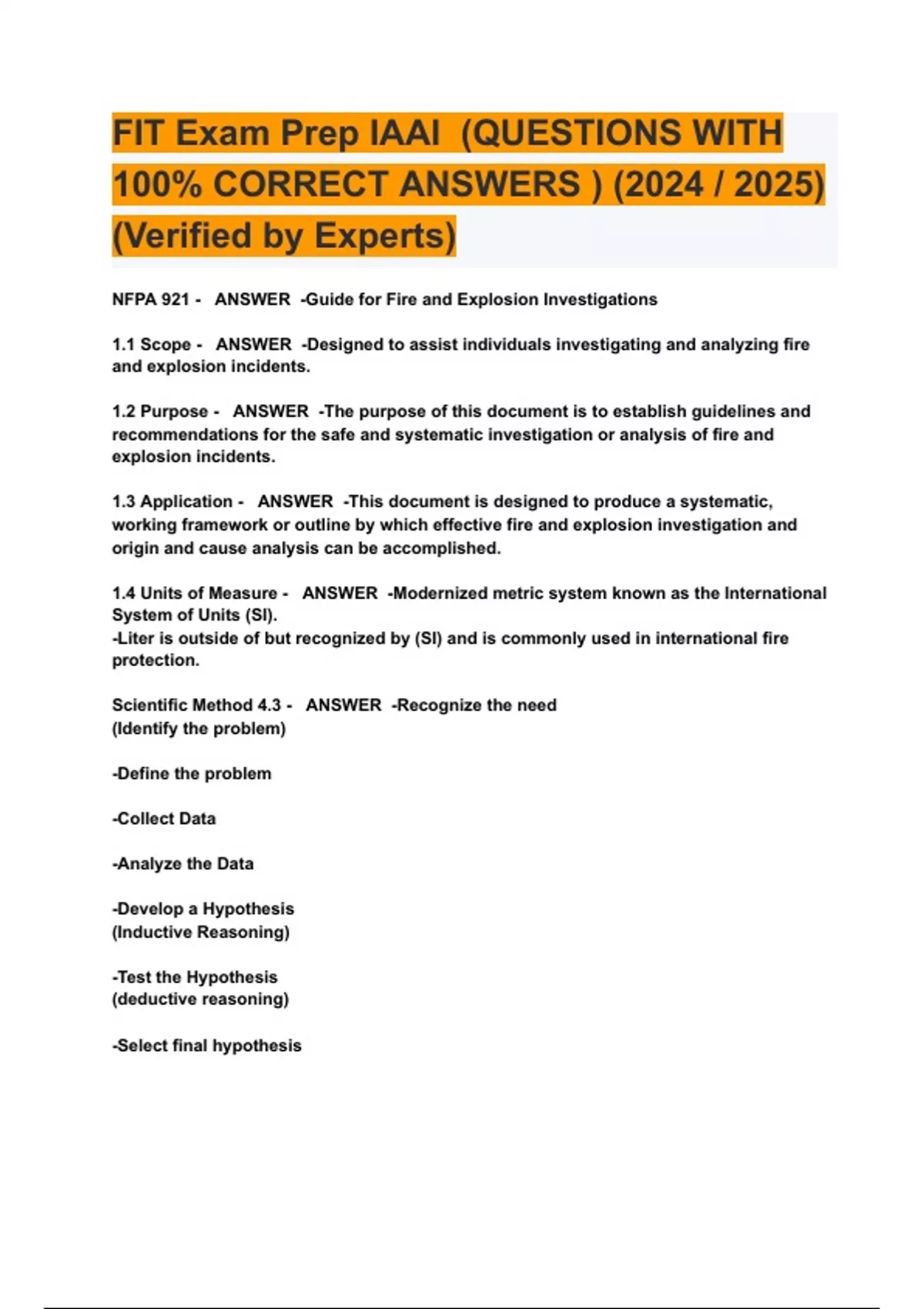 NFPA 921 - ANSWER -Guide for Fire and Explosion Investigations 1.1 Scope - ANSWER -Designed to assist individuals investigating and analyzing fire and explosion incidents. 1.2 Purpose - ANSWER -The purpose of this document is to establish guidelines and recommendations for the safe and systematic investigation or analysis of fire and explosion incidents