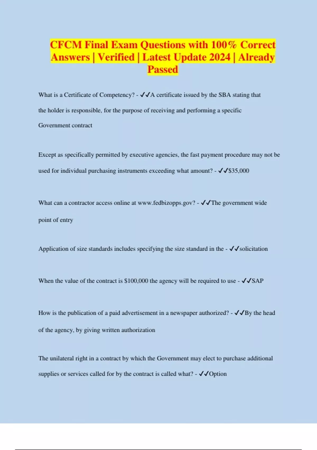 CFCM Final Exam Questions with 100% Correct Answers | Verified | Latest Update 2024 | Already Passed What is a Certificate of Competency? - A certificate issued by the SBA stating that the holder is responsible, for the purpose of receiving and performing a specific Government contract Except as specifically permitted by executive agencies, the fast payment procedure may not be used for individual purchasing instruments exceeding what amount? - $35,000 What can a contractor access online at ? - The government wide point of entry Application of size standards includes specifying the size standard in the - solicitation When the value of the contract is $100,000 the agency will be required to use - SAP How is the publication of a paid advertisement in a newspaper authorized? - By the head of the agency, by giving written authorization The unilateral right in a contract by which the Government may elect to purchase additional supplies or services called for by the contract is called what? - Option