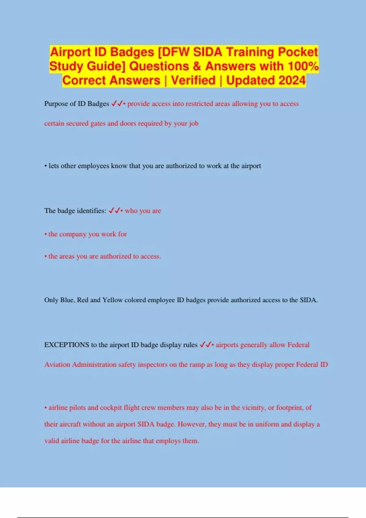 Airport ID Badges [DFW SIDA Training Pocket Study Guide] Questions & Answers with 100% Correct Answers | Verified | Updated 2024