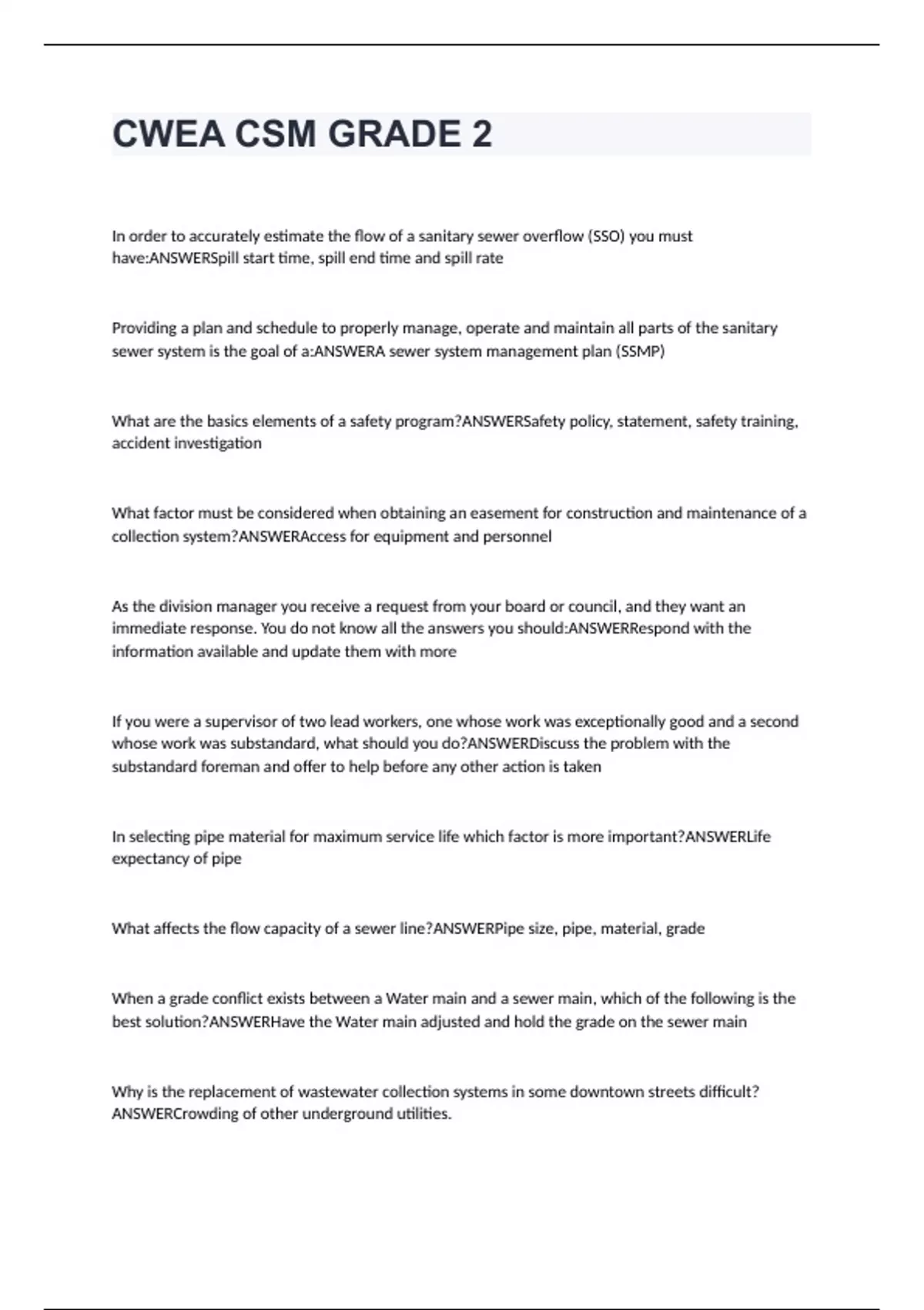 CWEA CSM GRADE 2 Exam Questions And Answers (GRADED A+)