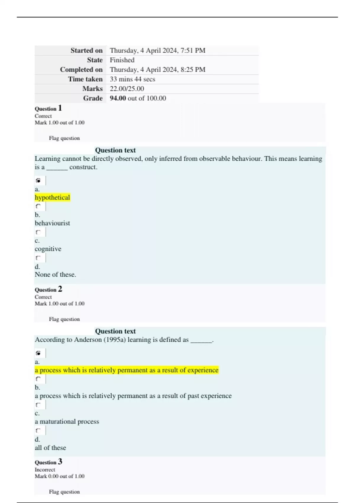 Learning cannot be directly observed, only inferred from observable behaviour. This means learning