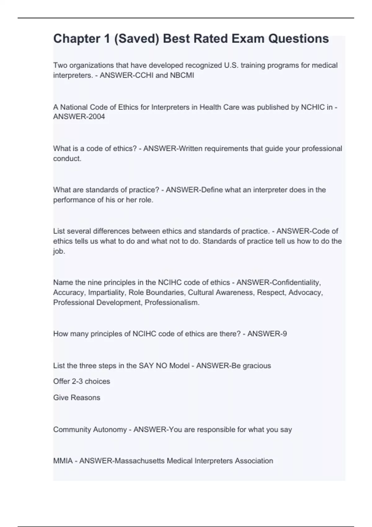 Two organizations that have developed recognized U.S. training programs for medical interpreters. - ANSWER-CCHI and NBCMI A National Code of Ethics for Interpreters in Health Care was published by NCHIC in - ANSWER-2004 What is a code of ethics? - ANSWER-Written requirements that guide your professional conduct. What are standards of practice? - ANSWER-Define what an interpreter does in the performance of his or her role. List several differences between ethics and standards of practice. - ANSWER-Code of ethics tells us what to do and what not to do. Standards of practice tell us how to do the job. Name the nine principles in the NCIHC code of ethics - ANSWER-Confidentiality, Accuracy, Impartiality, Role Boundaries, Cultural Awareness, Respect, Advocacy, Professional Development, Professionalism. How many principles of NCIHC code of ethics are there? - ANSWER-9 List the three steps in the SAY NO Model - ANSWER-Be gracious Offer 2-3 choices Give Reasons Community Autonomy - ANSWER-You are responsible for what you say MMIA - ANSWER-Massachusetts Medical Interpreters Association