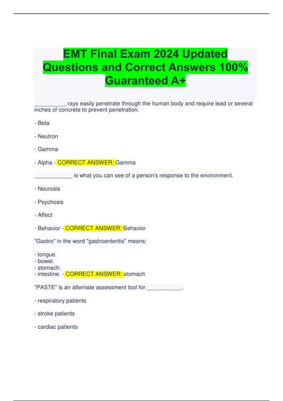 EMT Final Exam 2024 Updated Questions and Correct Answers 100% Guaranteed A+