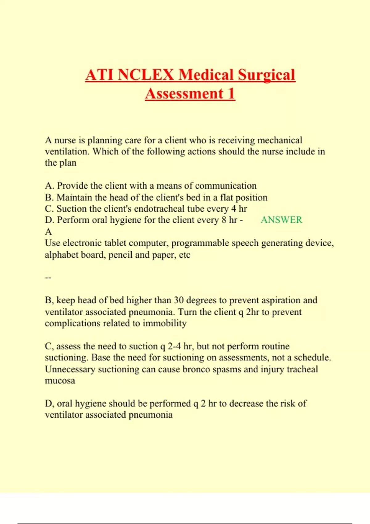 ATI NCLEX Medical Surgical Assessment 1 A nurse is planning care for a client who is receiving mechanical ventilation. Which of the following actions should the nurse include in the plan A. Provide the client with a means of communication B. Maintain the head of the client's bed in a flat position C. Suction the client's endotracheal tube every 4 hr D. Perform oral hygiene for the client every 8 hr - ANSWER A Use electronic tablet computer, programmable speech generating device, alphabet board, pencil and paper, etc -- B, keep head of bed higher than 30 degrees to prevent aspiration and ventilator associated pneumonia. Turn the client q 2hr to prevent complications related to immobility C, assess the need to suction q 2-4 hr, but not perform routine suctioning. Base the need for suctioning on assessments, not a schedule. Unnecessary suctioning can cause bronco spasms and injury tracheal mucosa D, oral hygiene should be performed q 2 hr to decrease the risk of ventilator associated pneumonia A nurse is caring for a client who is receiving IV fluid replacement therapy for dehydration. Which of the following laboratory results indicates effectiveness of the treatment A. Sodium 165 mEq/L B. Potassium 5.2 mEq/L C. Urine specific gravity 1.020 D. Hct 62% - ANSWER C Within the expected range of 1.005-1.030 -- A, sodium range is 136-145 B, potassium range is 3.5-5 D, Hct range is 37%-52% A nurse is monitoring the laboratory findings for a client who is postoperative following a total hip arthroplasty 6 hr ago. Which of the following values indicates that the client has an increased risk for bleeding A. PT 11.5 seconds B. aPTT 35 seconds C. Platelets 80,000 D. RBC 4.0 million - ANSWER C platelet range is 150,000-400,000 -- A, PT range is 11-12.5 B, aPTT range is 30-40 seconds D, RBC range is 4.2-6.1 million. A low RBC can indicate that bleeding has occurred, but it does not indicate that the client is at risk for bleeding A nurse is admitting a client who has a cervical spinal cord injury following a motor vehicle crash. Which of the following interventions is the nurse's priority while caring for this client A. Change the client's position every 2 hours B. Pad pressure points at the edges of the client's cervical collar C. Palpate the client's abdomen for bladder distention D. Assist the client with quad coughing - ANSWER D The greatest risk to a client who has a cervical spinal cord injury is an obstructed airway; the priority is to ensure the client can clear their airway. Apply abdominal pressure as the client coughs (quad coughing) A nurse is caring for a client who is receiving a blood transfusion. Which of the following findings indicates that the client is experiencing transfusion-associated circulatory overload A. Nasuea B. Hypothermia C. Dyspnea D. Bradycardia - ANSWER C Dyspnea is an indication of possible transfusion associated circulatory overload, leading to hypertension, bounding pulses, and confusion. Dyspnea can also indicate transfusion related acute lung injury to an anaphylactic response, which also causes wheezing, chest tightness, cyanosis, and low BP -- A, nausea can indicate an acute hemolytic transfusion reaction B, transfusion reactions include acute hemolytic, febrile, mild allergic, and anaphylactic D, bradycardia is not an indication