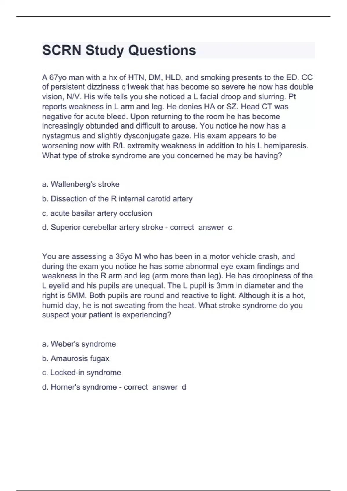 SCRN Study Questions and answers already passed 2024 A 67yo man with a hx of HTN, DM, HLD, and smoking presents to the ED. CC of persistent dizziness q1week that has become so severe he now has double vision, N/V. His wife tells you she noticed a L facial droop and slurring. Pt reports weakness in L arm and leg. He denies HA or SZ. Head CT was negative for acute bleed. Upon returning to the room he has become increasingly obtunded and difficult to arouse. You notice he now has a nystagmus and slightly dysconjugate gaze. His exam appears to be worsening now with R/L extremity weakness in addition to his L hemiparesis. What type of stroke syndrome are you concerned he may be having? a. Wallenberg's stroke b. Dissection of the R internal carotid artery c. acute basilar artery occlusion d. Superior cerebellar artery stroke - correct answer c You are assessing a 35yo M who has been in a motor vehicle crash, and during the exam you notice he has some abnormal eye exam findings and weakness in the R arm and leg (arm more than leg). He has droopiness of the L eyelid and his pupils are unequal. The L pupil is 3mm in diameter and the right is 5MM. Both pupils are round and reactive to light. Although it is a hot, humid day, he is not sweating from the heat. What stroke syndrome do you suspect your patient is experiencing? a. Weber's syndrome b. Amaurosis fugax c. Locked-in