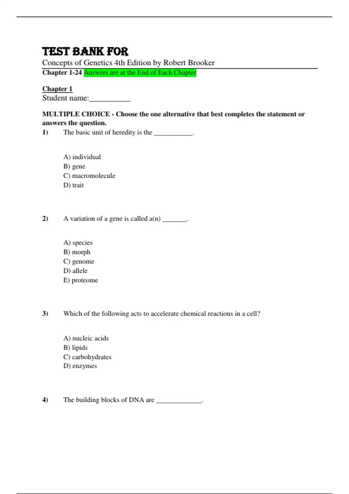 Test Bank For Concepts of Genetics 4th Edition By Robert Brooker Chapter 1-24