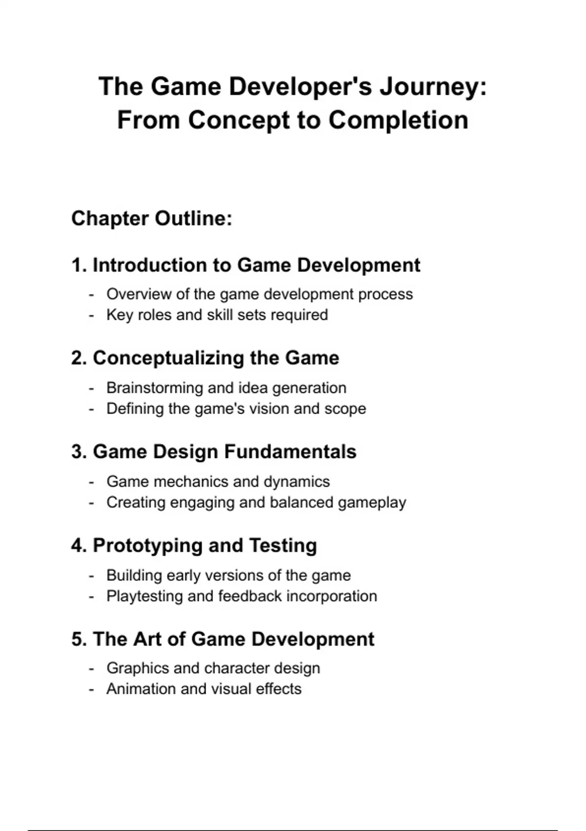 The Game Developer's Journey: From Concept to Completion" provides a comprehensive overview of the game development process, from the initial idea and concept stages through to design, programming, testing, and post-launch support. It covers various aspects such as art and design, programming, audio production, UI/UX, storytelling, marketing, and the business side of game development. The book also explores future trends and offers case studies of successful games, providing readers with a thorough understanding of the game development industry.