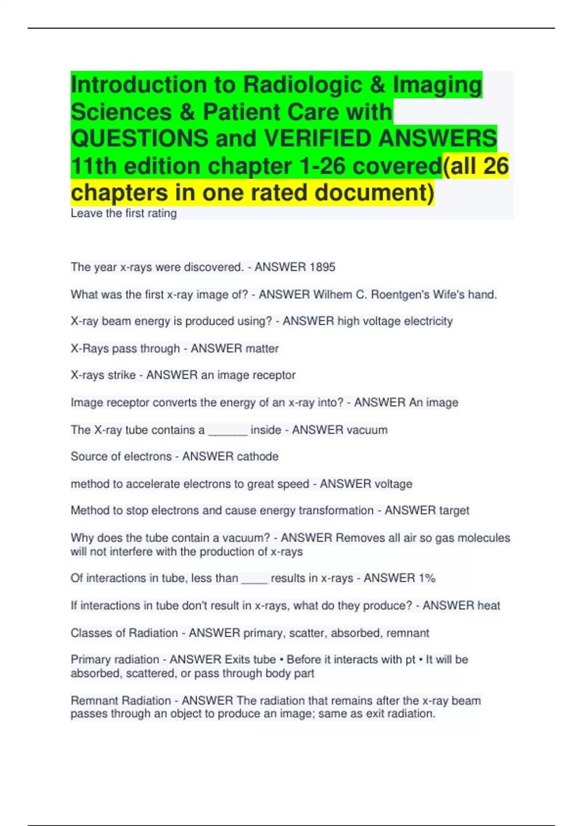 Introduction to Radiologic & Imaging Sciences & Patient Care chapters with QUESTIONS and VERIFIED ANSWERS 11th edition chapter 1-26 covered(all 26 chapters in one rated document)