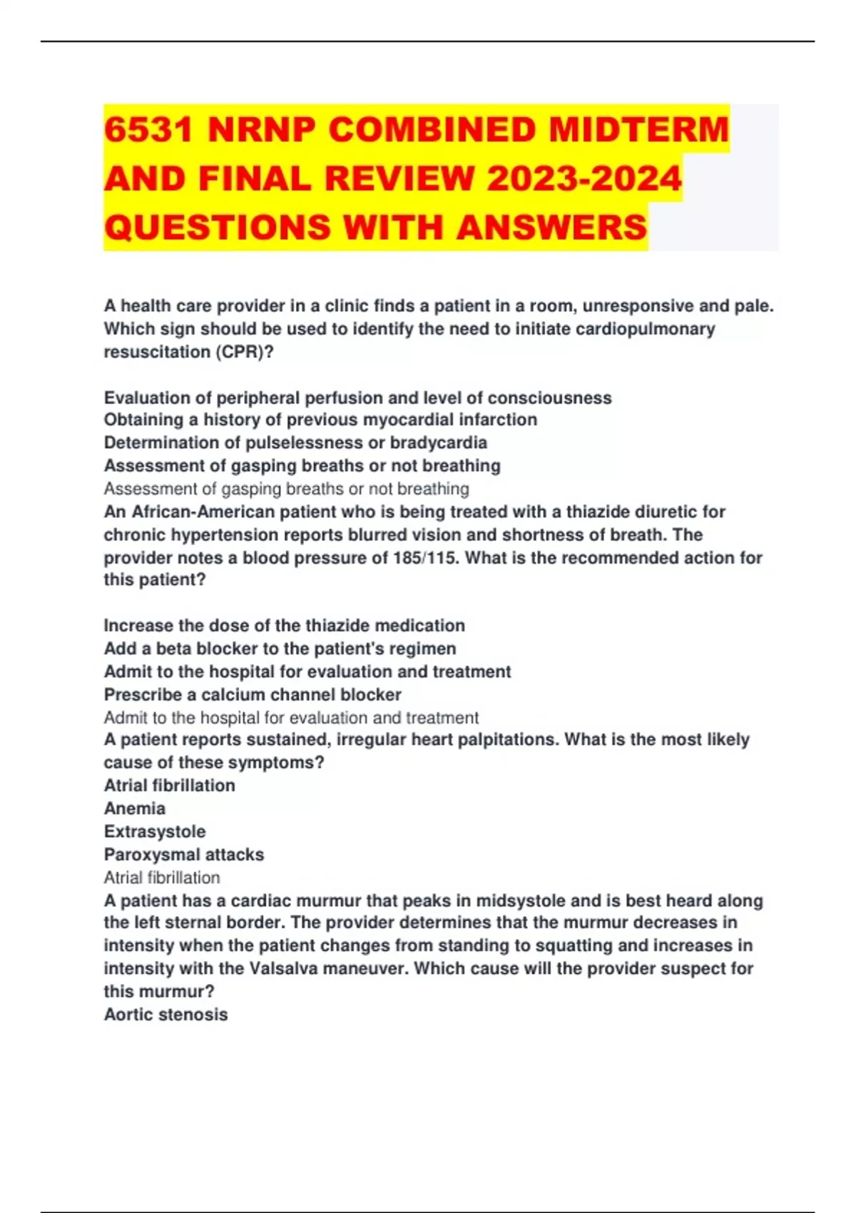 6531 NRNP COMBINED MIDTERM AND FINAL REVIEW QUESTIONS WITH ANSWERS A health care provider in a clinic finds a patient in a room, unresponsive and pale. Which sign should be used to identify the need to initiate cardiopulmonary resuscitation (CPR)? Evaluation of peripheral perfusion and level of consciousness Obtaining a history of previous myocardial infarction Determination of pulselessness or bradycardia Assessment of gasping breaths or not breathing Assessment of gasping breaths or not breathing An African-American patient who is being treated with a thiazide diuretic for chronic hypertension reports blurred vision and shortness of breath. The provider notes a blood pressure of 185/115. What is the recommended action for this patient? Increase the dose of the thiazide medication Add a beta blocker to the patient's regimen Admit to the hospital for evaluation and treatment Prescribe a calcium channel blocker Admit to the hospital for evaluation and treatment A patient reports sustained, irregular heart palpitations. What is the most likely cause of these symptoms? Atrial fibrillation Anemia Extrasystole Paroxysmal attacks Atrial fibrillation A patient has a cardiac murmur that peaks in midsystole and is best heard along the left sternal border. The provider determines that the murmur decreases in intensity when the patient changes from standing to squatting and increases in intensity with the Valsalva maneuver. Which cause will the provider suspect for this murmur? Aortic stenosis Tricuspid regurgitation Hypertrophic cardiomyopathy Mitral valve prolapse Hypertrophic cardiomyopathy A patient is brought to an emergency department with symptoms of acute ST-segment elevation MI (STEMI). The nearest hospital that can perform percutaneous coronary intervention (PCI) is 3 hours away. What is the initial treatment for this patient? Give the patient an oral beta blocker Transfer to the PCI-capable institution Administer heparin Initiate fibrinolytic treatment Initiate fibrinolytic treatment Patients who meet the criteria for statin therapy to help prevent atherosclerotic cardiovascular disease are those with a history of (Select all that apply.) previous myocardial infarction. a low-density lipoprotein (LDL) level >190 mg/dL. diabetes and an LDL between 40 and 70 mg/dL. a 10 year risk score of 8% with an LDL of 80 mg/dL. a 10 year risk score of 5% and an LDL of 165 mg/dL. previous myocardial infarction. a low-density lipoprotein (LDL) level >190 mg/dL. a 10 year risk score of 8% with an LDL of 80 mg/dL. A 75-year-old patient reports pain and a feeling of tiredness in both legs that only relieves after sitting for 30 minutes or more. What the does provider suspect as the cause for these symptoms? Buerger's disease Cauda equina syndrome Diabetic neuropathy Peripheral arterial disease Cauda equina syndrome Which are causes of secondary hypertension? (Select all that apply.) Oral contraceptives Isometic excercises NSAIDS Sleep apnea Increased salt intake Oral contraceptives NSAIDS Sleep apnea A young female patient has known mitral valve prolapse. During a routine health maintenance exam, the provider notes an apical systolic murmur and a midsystolic click on auscultation. The patient denies chest pain, syncope, or palpitations. What will the provider do? Reassure the patient that these findings are expected Continue to monitor the patient every 3 years Admit the patient to the hospital for evaluation and treatment Consult with cardiology to determine appropriate diagnostic tests Consult with cardiology to determine appropriate diagnostic tests A patient reports abdominal and back pain with anorexia and nausea. During an exam, the provider notes a pulsatile abdominal mass. What is the initial action? Scheduling an MRI to evaluate for aortic disease Immediate referral to a thoracic surgeon US of the mass to determine size Ordering CT angiography US of the mass to determine size A patient is brought to an emergency department with symptoms of acute ST-segment elevations MI (STEMI). The nearest hospital that can perform percutaneous coronary intervention (PCI) is 3 hours away. What is the initial treatment for this patient? Give the patient an oral beta blocker Initiate fibrinolytic treatment Administer heparin Transfer to the PCI-capable institution Initiate fibrinolytic treatment A 55-year-old patient has a blood pressure of 138/85 on three occasions. The patient denies headaches, palpitations, snoring, muscle weakness, and nocturia and does not take any medications. What will the provider do next to evaluate this patient? Continue to monitor blood pressure at each health maintenance visit Assess serum cortisol levels Order urinalysis, CBC, BUN and creatinine Refer to specialist for sleep study Order urinalysis, CBC, BUN and creatinine A patient is diagnosed with PAD and elects to not have angioplasty after an angiogram reveals partial obstruction in lower extremity arteries. What will the provider recommend to help with relief of symptoms in this patient? Statin therapy with clopidogrel Walking to the point of pain each day