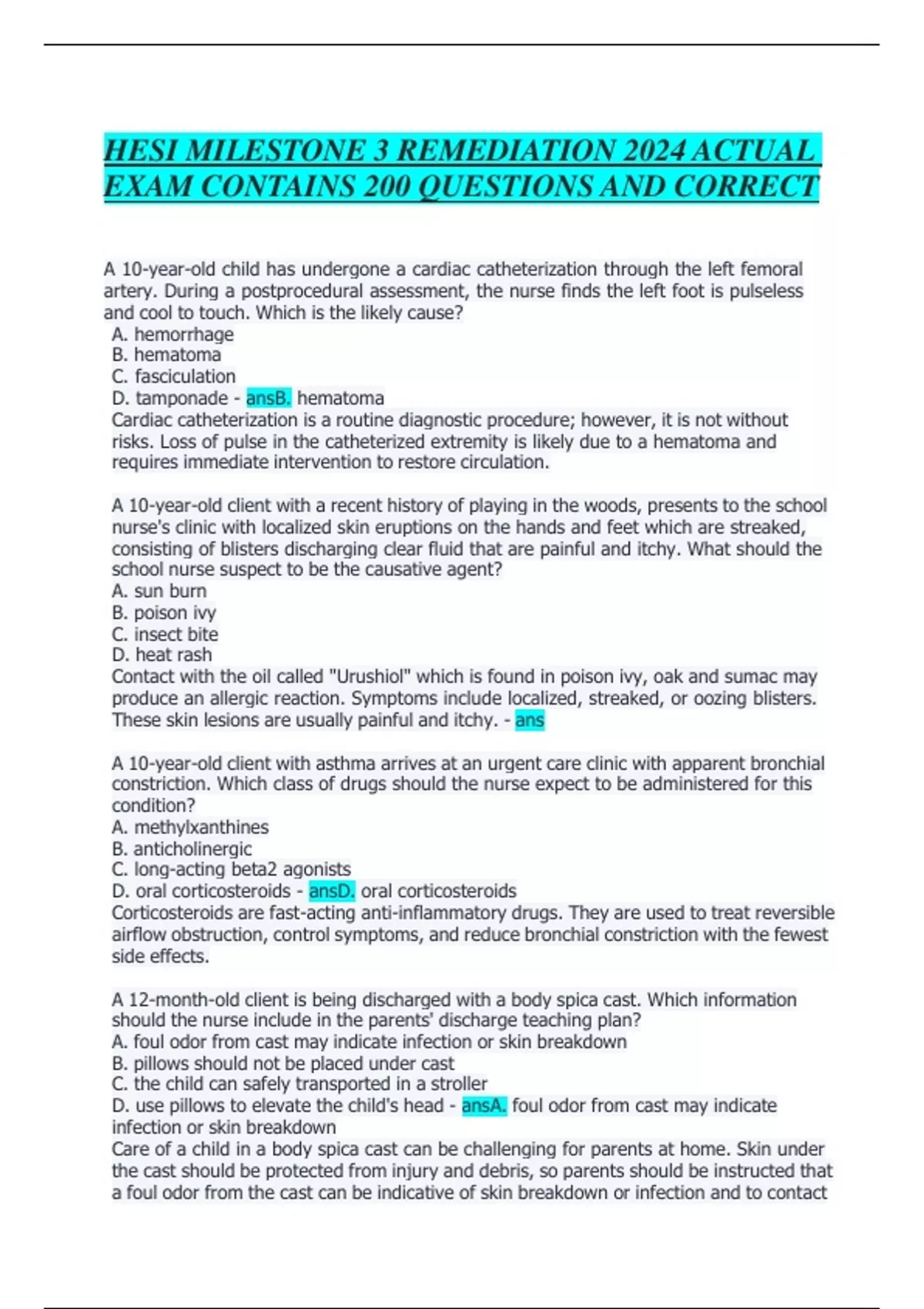 HESI MILESTONE 3 REMEDIATION 2024 ACTUAL EXAM CONTAINS 200 QUESTIONS AND CORRECT ANSWERS