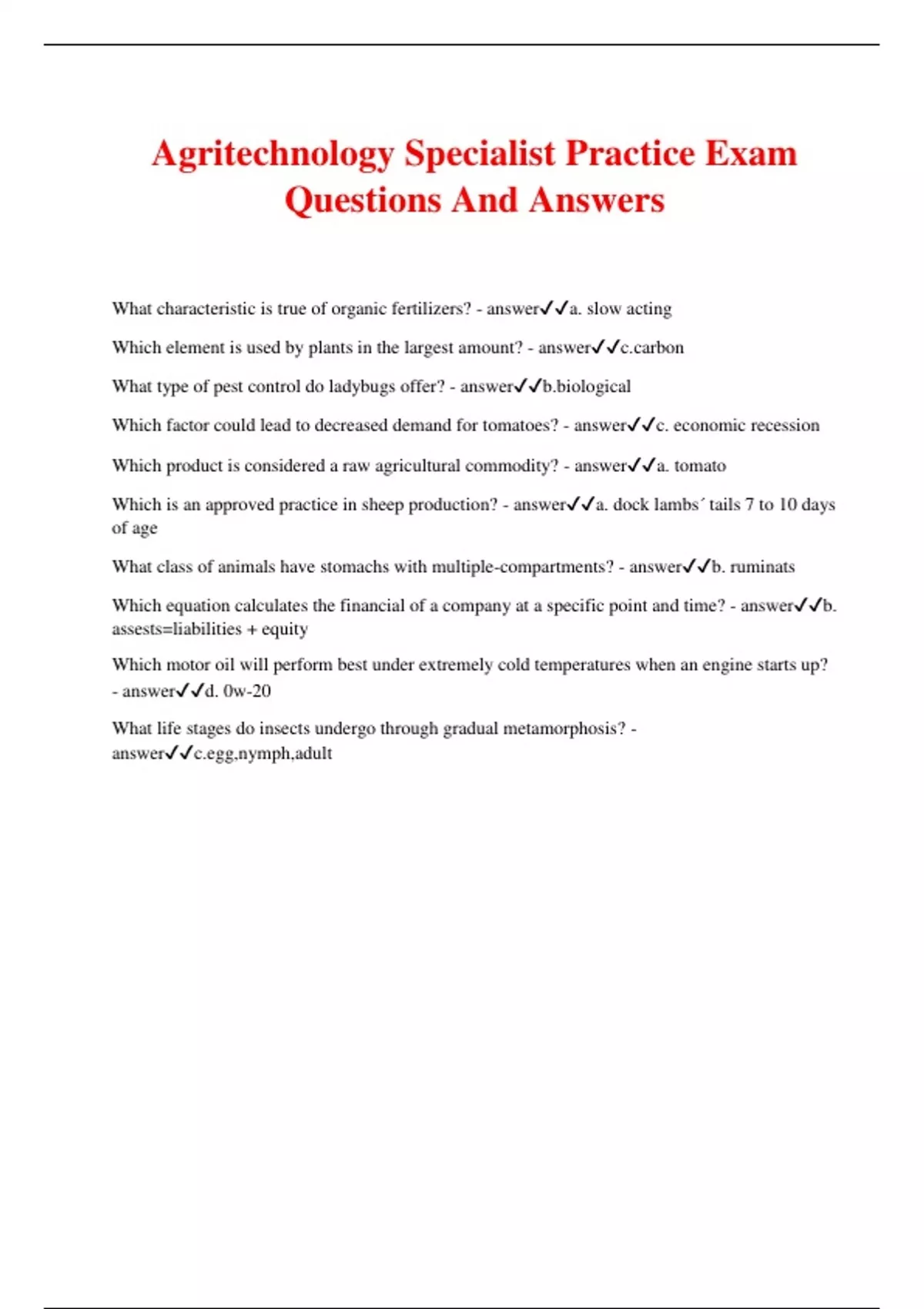Agritechnology Specialist Practice Exam Questions And Answers What characteristic is true of organic fertilizers? - answera. slow acting Which element is used by plants in the largest amount? - answern What type of pest control do ladybugs offer? - answergical Which factor could lead to decreased demand for tomatoes? - answerc. economic recession Which product is considered a raw agricultural commodity? - answera. tomato Which is an approved practice in sheep production? - answera. dock lambs´ tails 7 to 10 days of age