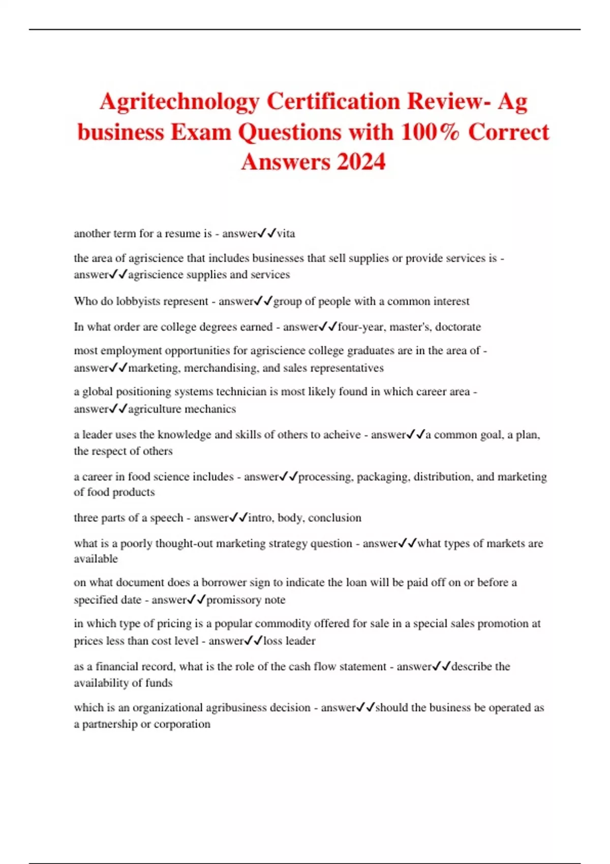Agritechnology Certification Review- Ag business Exam Questions with 100% Correct Answers 2024 another term for a resume is - answervita the area of agriscience that includes businesses that sell supplies or provide services is - answeragriscience supplies and services Who do lobbyists represent - answergroup of people with a common interest In what order are college degrees earned - answerfour-year, master's, doctorate most employment opportunities for agriscience college graduates are in the area of - answermarketing, merchandising, and sales representatives a global positioning systems technician is most likely found in which career area - answeragriculture mechanics a leader uses the knowledge and skills of others to acheive - answera common goal, a plan, the respect of others a career in food science includes - answerprocessing, packaging, distribution, and marketing of food products three parts of a speech - answerintro, body, conclusion what is a poorly thought-out marketing strategy question - answerwhat types of markets are available on what document does a borrower sign to indicate the loan will be paid off on or before a specified date - answerpromissory note in which type of pricing is a popular commodity offered for sale in a special sales promotion at prices less than cost level - answerloss leader as a financial record, what is the role of the cash flow statement - answerdescribe the availability of funds which is an organizational agribusiness decision - answershould the business be operated as a partnership or corporation