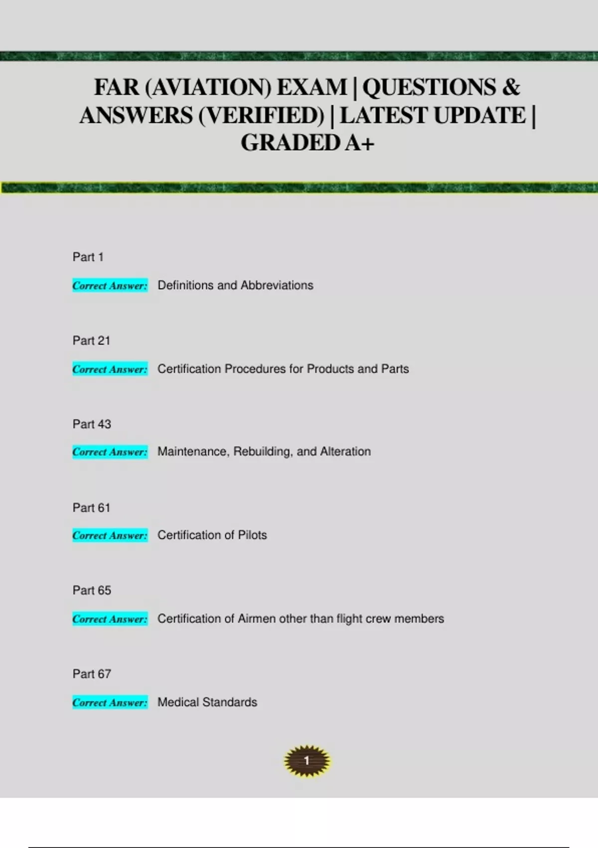 Part 1 Correct Answer: Definitions and Abbreviations Part 21 Correct Answer: Certification Procedures for Products and Parts Part 43 Correct Answer: Maintenance, Rebuilding, and Alteration Part 61 Correct Answer: Certification of Pilots Part 65 Correct Answer: Certification of Airmen other than flight crew members