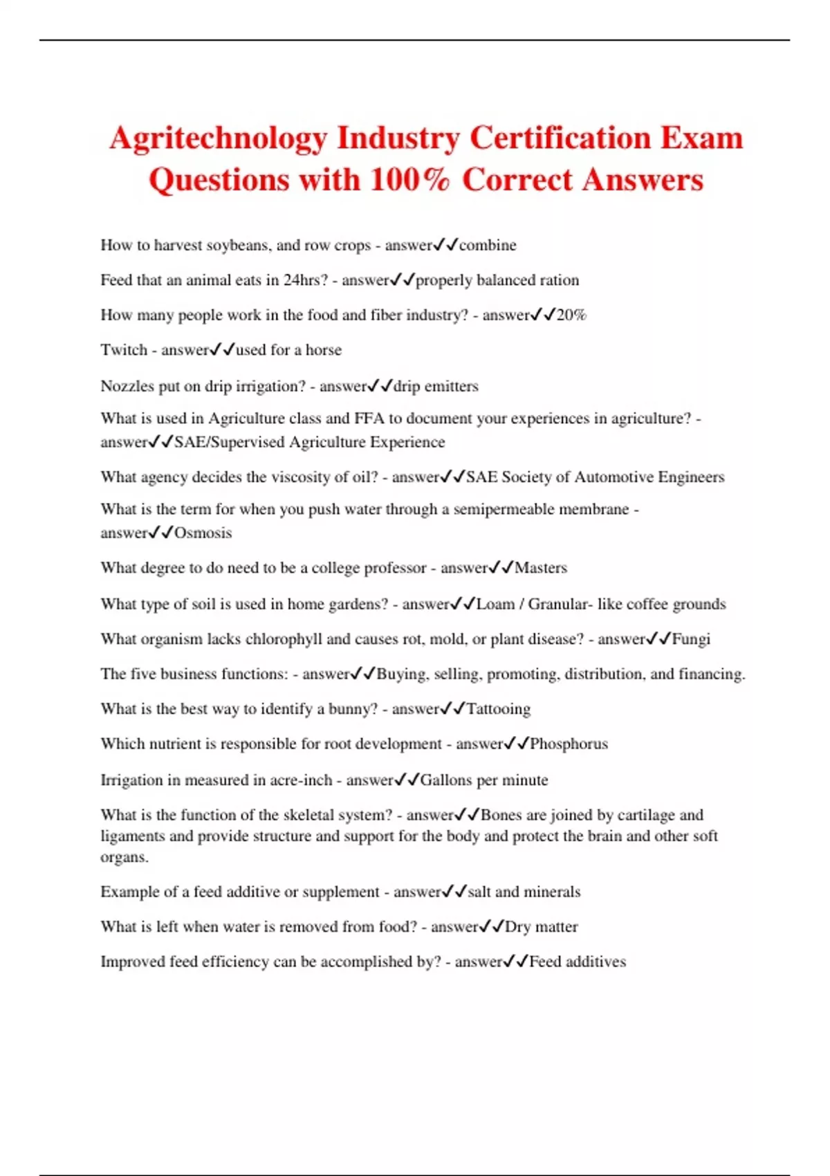 Agritechnology Industry Certification Exam Questions with 100% Correct Answers How to harvest soybeans, and row crops - answercombine Feed that an animal eats in 24hrs? - answerproperly balanced ration How many people work in the food and fiber industry? - answer20% Twitch - answerused for a horse Nozzles put on drip irrigation? - answerdrip emitters What is used in Agriculture class and FFA to document your experiences in agriculture? - answerSAE/Supervised Agriculture Experience What agency decides the viscosity of oil? - answerSAE Society of Automotive Engineers What is the term for when you push water through a semipermeable membrane - answerOsmosis What degree to do need to be a college professor - answerMasters What type of soil is used in home gardens? - answerLoam / Granular- like coffee grounds What organism lacks chlorophyll and causes rot, mold, or plant disease? - answerFungi The five business functions: - answerBuying, selling, promoting, distribution, and financing. What is the best way to identify a bunny? - answerTattooing Which nutrient is responsible for root development - answerPhosphorus Irrigation in measured in acre-inch - answerGallons per minute What is the function of the skeletal system? - answerBones are joined by cartilage and ligaments and provide structure and support for the body and protect the brain and other soft organs. Example of a feed additive or supplement - answersalt and minerals What is left when water is removed from food? - answerDry matter Improved feed efficiency can be accomplished by? - answerFeed additives