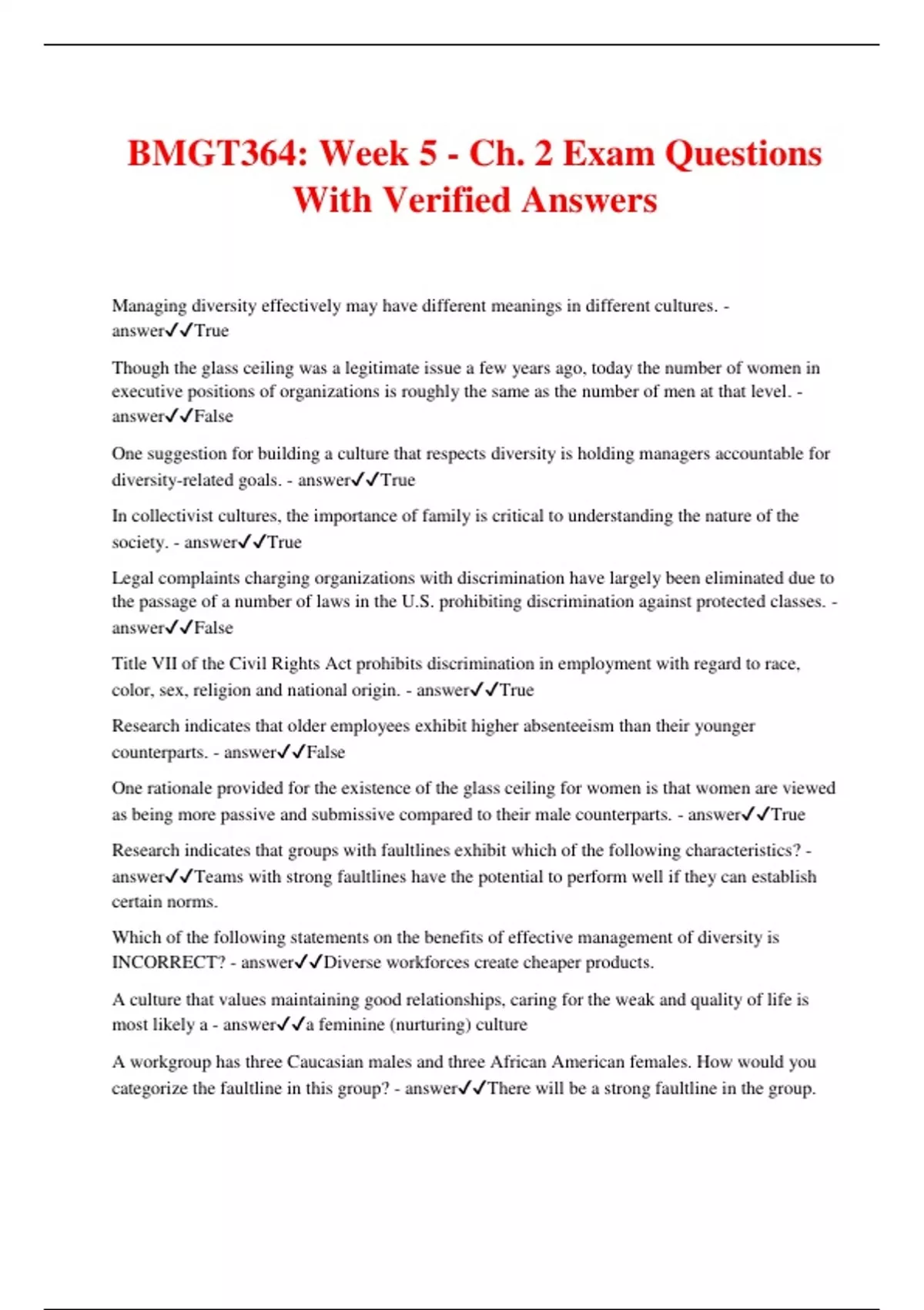 BMGT364: Week 5 - Ch. 2 Exam Questions With Verified Answers Managing diversity effectively may have different meanings in different cultures. - answerTrue Though the glass ceiling was a legitimate issue a few years ago, today the number of women in executive positions of organizations is roughly the same as the number of men at that level. - answerFalse One suggestion for building a culture that respects diversity is holding managers accountable for diversity-related goals. - answerTrue In collectivist cultures, the importance of family is critical to understanding the nature of the society. - answerTrue Legal complaints charging organizations with discrimination have largely been eliminated due to the passage of a number of laws in the U.S. prohibiting discrimination against protected classes. - answerFalse Title VII of the Civil Rights Act prohibits discrimination in employment with regard to race, color, sex, religion and national origin. - answerTrue Research indicates that older employees exhibit higher absenteeism than their younger counterparts. - answerFalse One rationale provided for the existence of the glass ceiling for women is that women are viewed as being more passive and submissive compared to their male counterparts. - answerTrue Research indicates that groups with faultlines exhibit which of the following characteristics? - answerTeams with strong faultlines have the potential to perform well if they can establish certain norms. Which of the following statements on the benefits of effective management of diversity is INCORRECT? - answerDiverse workforces create cheaper products. A culture that values maintaining good relationships, caring for the weak and quality of life is most likely a - answera feminine (nurturing) culture A workgroup has three Caucasian males and three African American females. How would you categorize the faultline in this group? - answerThere will be a strong faultline in the group.