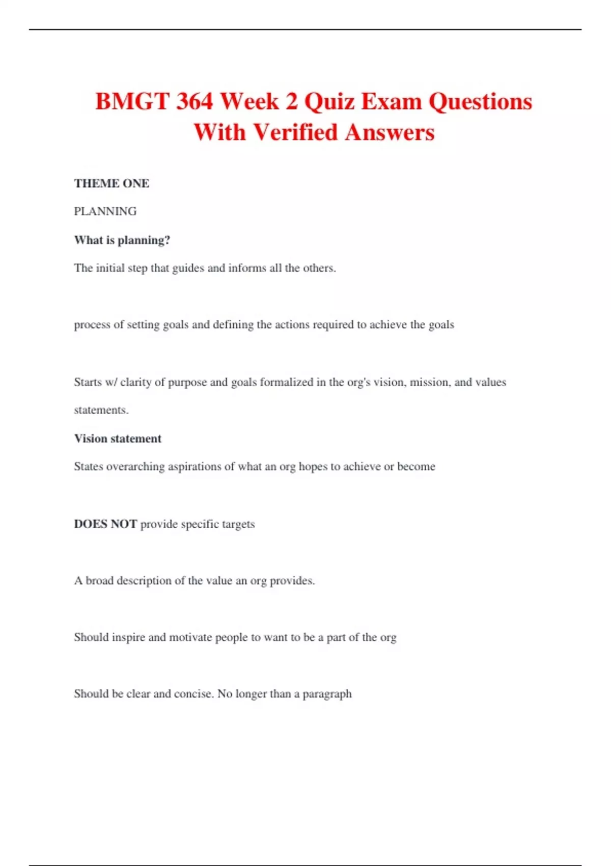 BMGT 364 Week 2 Quiz Exam Questions With Verified Answers THEME ONE PLANNING What is planning? The initial step that guides and informs all the others. process of setting goals and defining the actions required to achieve the goals Starts w/ clarity of purpose and goals formalized in the org's vision, mission, and values statements. Vision statement States overarching aspirations of what an org hopes to achieve or become DOES NOT provide specific targets A broad description of the value an org provides. Should inspire and motivate people to want to be a part of the org Should be clear and concise. No longer than a paragraph Examples: Disney- to make people happy IKEA - create a better everyday life for many people Mission statement Describes what the org needs to do now to achieve the vision Must support vision statement and vice versa More specific Defines how the org will be different from other orgs in its industry Indicates where the org competes and how it will compete Should allow leaders to develop coherent goals in support of. Strategic goals Broad goals an org will try to achieve Values statement (Code of ethics) defines what the org believes in and how people in the org are expected to behave—with each other, customers, suppliers, and stakeholders. provides a moral direction for the org that guides decision making and establishes a standard for assessing actions provides a standard for employees to judge violations must be reinforced at all levels of the org and must be used to guide attitudes and actions to be effective Goals derived from the vision and mission statements Benefits of planning provides a guide for action improves resource utilization provide motivation and commitment set performance standards allows flexibility Drawbacks to planning prevents action leads to complacency