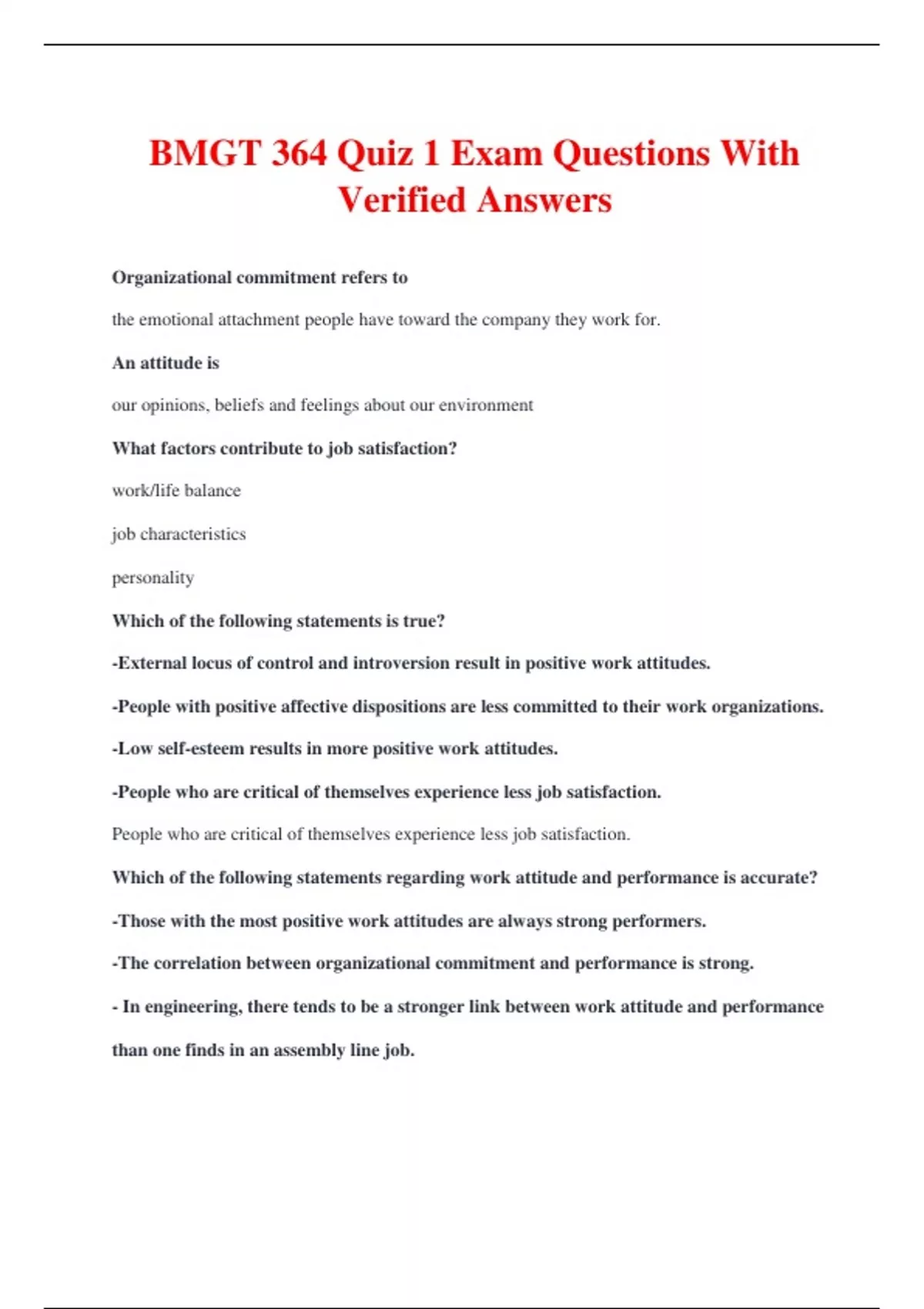 BMGT 364 Quiz 1 Exam Questions With Verified Answers Organizational commitment refers to the emotional attachment people have toward the company they work for. An attitude is our opinions, beliefs and feelings about our environment What factors contribute to job satisfaction? work/life balance job characteristics personality Which of the following statements is true? -External locus of control and introversion result in positive work attitudes. -People with positive affective dispositions are less committed to their work organizations. -Low self-esteem results in more positive work attitudes. -People who are critical of themselves experience less job satisfaction. People who are critical of themselves experience less job satisfaction. Which of the following statements regarding work attitude and performance is accurate? -Those with the most positive work attitudes are always strong performers. -The correlation between organizational commitment and performance is strong. - In engineering, there tends to be a stronger link between work attitude and performance than one finds in an assembly line job.