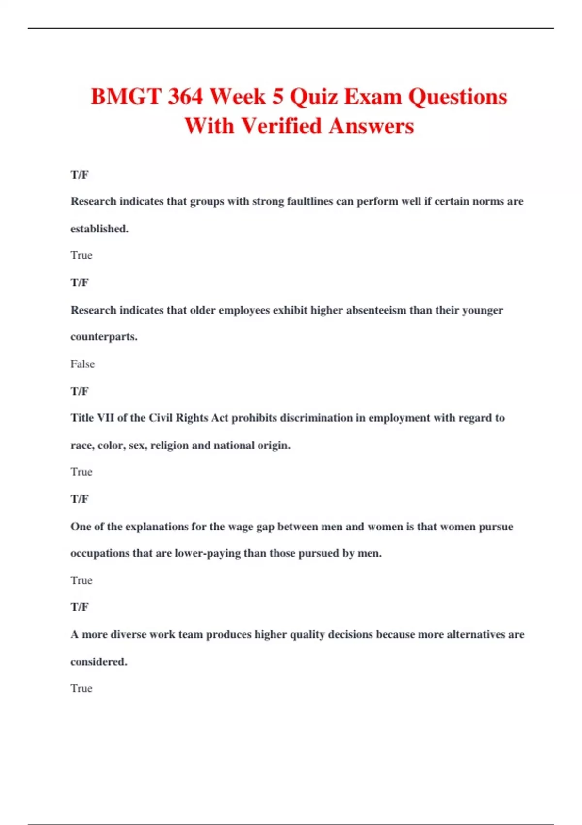 BMGT 364 Week 5 Quiz Exam Questions With Verified Answers T/F Research indicates that groups with strong faultlines can perform well if certain norms are established. True T/F Research indicates that older employees exhibit higher absenteeism than their younger counterparts. False T/F Title VII of the Civil Rights Act prohibits discrimination in employment with regard to race, color, sex, religion and national origin. True T/F One of the explanations for the wage gap between men and women is that women pursue occupations that are lower-paying than those pursued by men. True T/F A more diverse work team produces higher quality decisions because more alternatives are considered. True