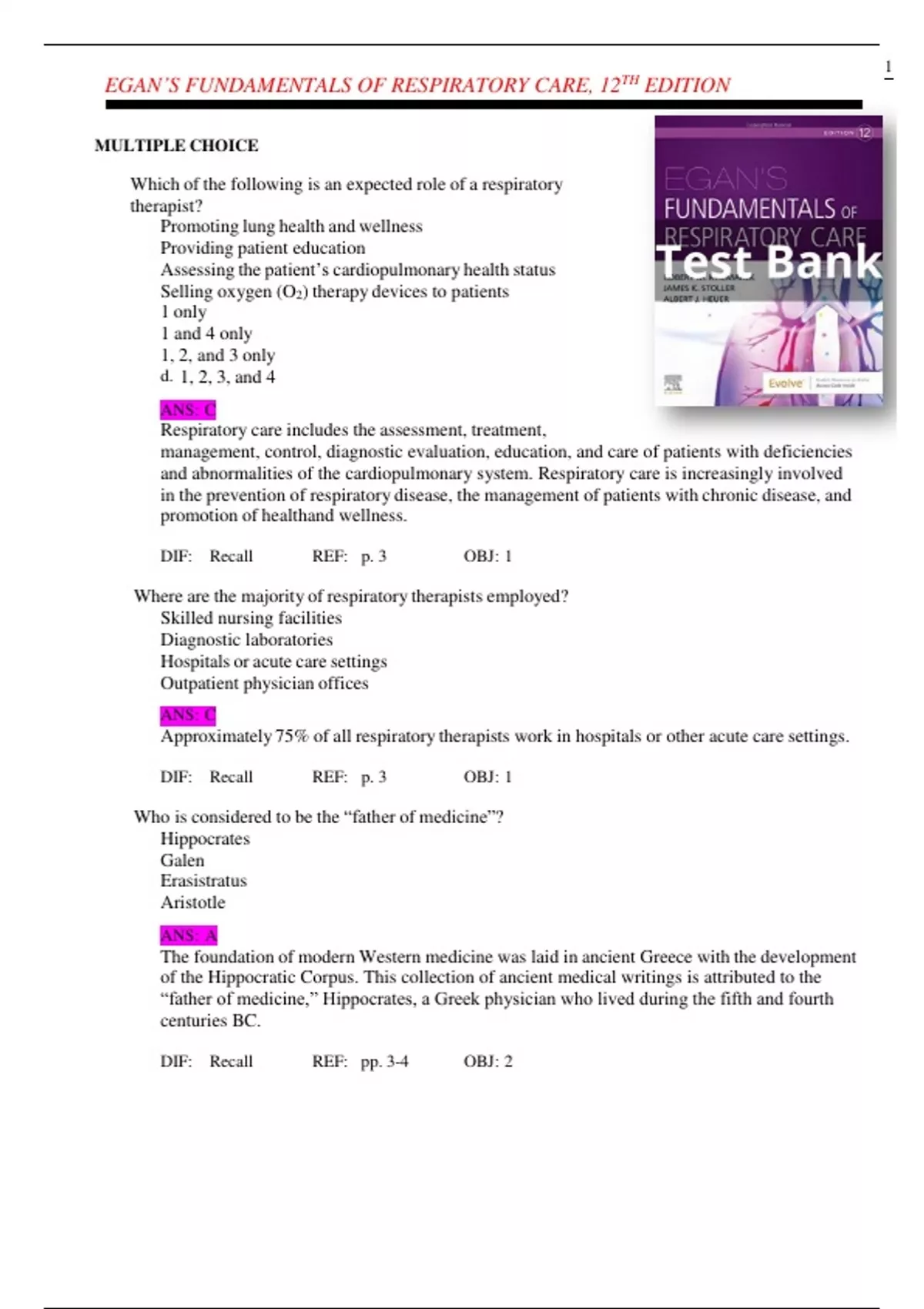 EGAN’S FUNDAMENTALS OF RESPIRATORY CARE, 12TH EDITION MULTIPLE CHOICE Which of the following is an expected role of a respiratory therapist? Promoting lung health and wellness Providing patient education Assessing the patient’s cardiopulmonary health status Selling oxygen (O2) therapy devices to patients 1 only 1 and 4 only 1, 2, and 3 only d. 1, 2, 3, and 4 ANS: C Respiratory care includes the assessment, treatment, management, control, diagnostic evaluation, education, and care of patients with deficiencies and abnormalities of the cardiopulmonary system. Respiratory care is increasingly involved in the prevention of respiratory disease, the management of patients with chronic disease, and promotion of healthand wellness. DIF: Recall REF: p. 3 OBJ: 1 Where are the majority of respiratory therapists employed? Skilled nursing facilities Diagnostic laboratories Hospitals or acute care settings Outpatient physician offices ANS: C Approximately 75% of all respiratory therapists work in hospitals or other acute care settings.