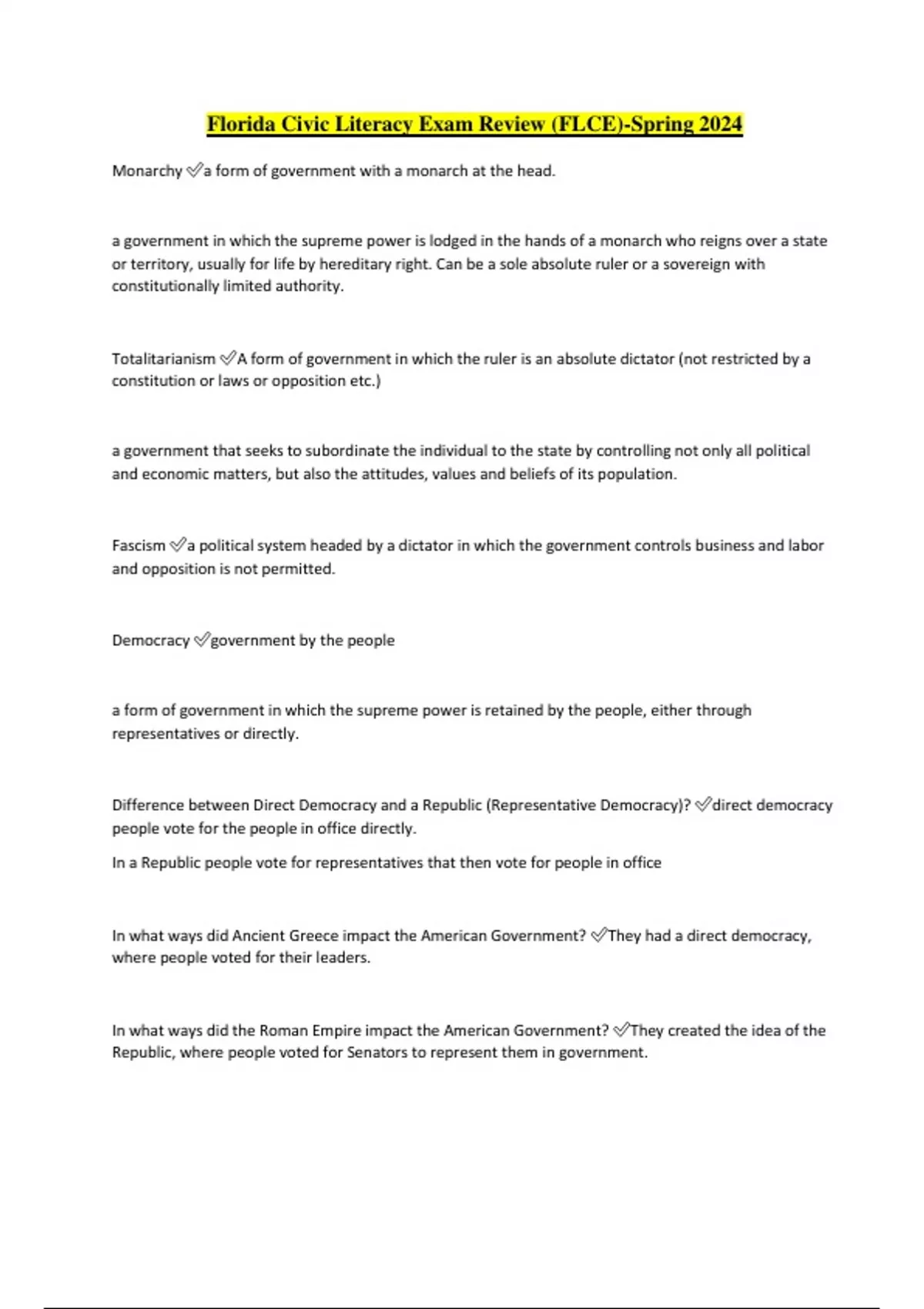 Florida Civic Literacy Exam Review (FLCE)-Spring 2024 Monarchy a form of government with a monarch at the head. a government in which the supreme power is lodged in the hands of a monarch who reigns over a state or territory, usually for life by hereditary right. Can be a sole absolute ruler or a sovereign with constitutionally limited authority. Totalitarianism A form of government in which the ruler is an absolute dictator (not restricted by a constitution or laws or opposition etc.) a government that seeks to subordinate the individual to the state by controlling not only all political and economic matters, but also the attitudes, values and beliefs of its population. Fascism a political system headed by a dictator in which the government controls business and labor and opposition is not permitted. Democracy government by the people a form of government in which the supreme power is retained by the people, either through representatives or directly. Difference between Direct Democracy and a Republic (Representative Democracy)? direct democracy people vote for the people in office directly. In a Republic people vote for representatives that then vote for people in office In what ways did Ancient Greece impact the American Government? They had a direct democracy, where people voted for their leaders. In what ways did the Roman Empire impact the American Government? They created the idea of the Republic, where people voted for Senators to represent them in government. Natural Rights Rights that are guaranteed by a person's birth, life, liberty, property Declaration of Independence It's the document that the congress set out to declare independence from the British Empire Signed in 1776 referred to: -Self Government -Working together for greater/ common good -Each state is independent and has full Power to levy War, conclude Peace, contract Alliances, establish Commerce, and to do all other Acts and Things which Independent States may of right do. Consent of the Governed The people give their permission to the government leaders to rule; usually through voting. Social Contract its a contract set out at birth, for a person to follow a set list of agreed upon rules. Pushed by John Locke Checks and Balances Way to make sure no one branch of government gets too much power, by allowing, each branch to check the power of the other branches Rule of Law Nobody is above the law and everyone is subject to the law US Constitution Current plan of government, set out the rules and laws that govern the United States today outlines the supreme law of the land, supersedes the articles of confederation, and gives the general outline for how the government works. Due Process You have the right to be treated equally under that law. You also have the right to certain
