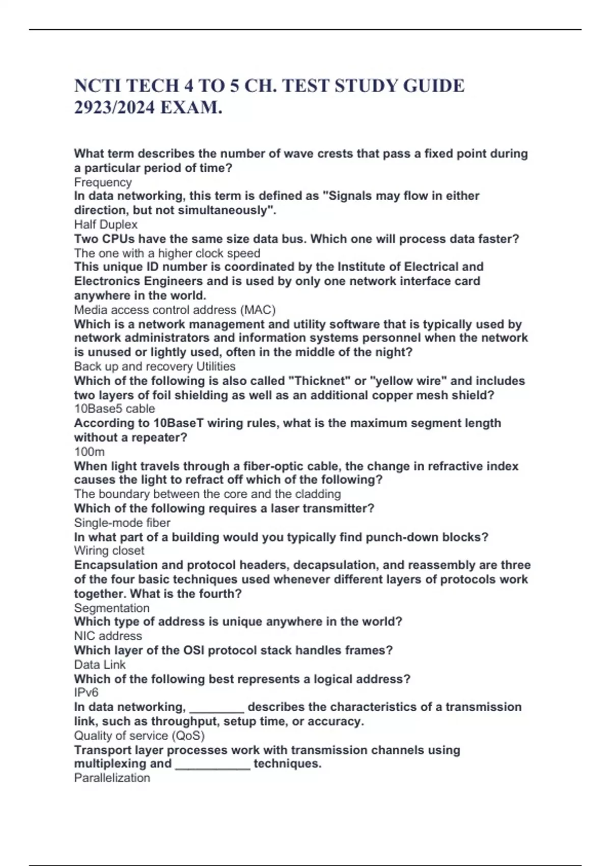 NCTI TECH 4 TO 5 CH. TEST STUDY GUIDE 2923/2024 EXAM. What term describes the number of wave crests that pass a fixed point during a particular period of time? Frequency In data networking, this term is defined as "Signals may flow in either direction, but not simultaneously". Half Duplex Two CPUs have the same size data bus. Which one will process data faster? The one with a higher clock speed This unique ID number is coordinated by the Institute of Electrical and Electronics Engineers and is used by only one network interface card anywhere in the world. Media access control address (MAC) Which is a network management and utility software that is typically used by network administrators and information systems personnel when the network is unused or lightly used, often in the middle of the night? Back up and recovery Utilities Which of the following is also called "Thicknet" or "yellow wire" and includes two layers of foil shielding as well as an additional copper mesh shield? 10Base5 cable According to 10BaseT wiring rules, what is the maximum segment length without a repeater? 100m When light travels through a fiber-optic cable, the change in refractive index causes the light to refract off which of the following? The boundary between the core and the cladding Which of the following requires a laser transmitter? Single-mode fiber In what part of a building would you typically find punch-down blocks? Wiring closet Encapsulation and protocol headers, decapsulation, and reassembly are three of the four basic techniques used whenever different layers of protocols work together. What is the fourth? Segmentation Which type of address is unique anywhere in the world? NIC address Which layer of the OSI protocol stack handles frames? Data Link Which of the following best represents a logical address? IPv6 In data networking, ________ describes the characteristics of a transmission link, such as throughput, setup time, or accuracy. Quality of service (QoS) Transport layer processes work with transmission channels using multiplexing and ___________ techniques.