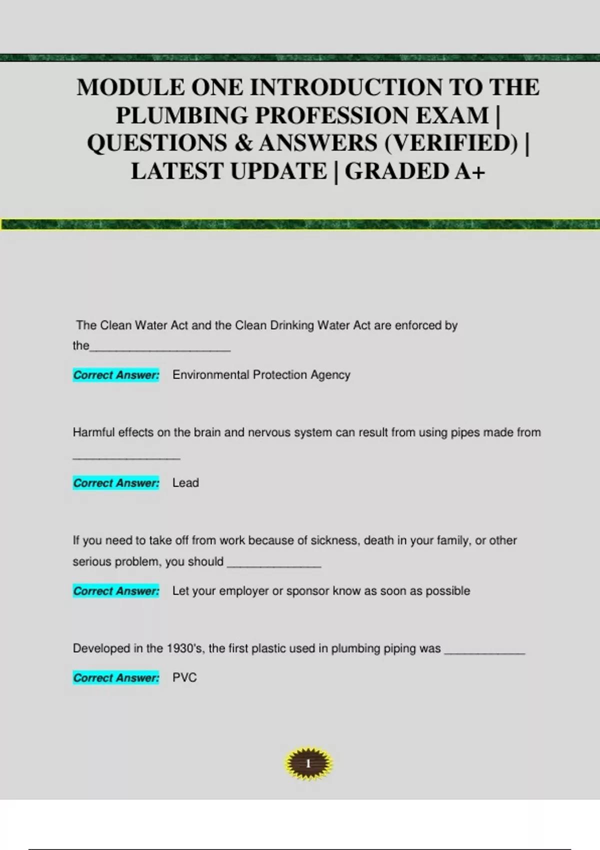 The Clean Water Act and the Clean Drinking Water Act are enforced by the_____________________ Correct Answer: Environmental Protection Agency Harmful effects on the brain and nervous system can result from using pipes made from ________________ Correct Answer: Lead If you need to take off from work because of sickness, death in your family, or other serious problem, you should ______________ Correct Answer: Let your employer or sponsor know as soon as possible Developed in the 1930's, the first plastic used in plumbing piping was ____________ Correct Answer: PV