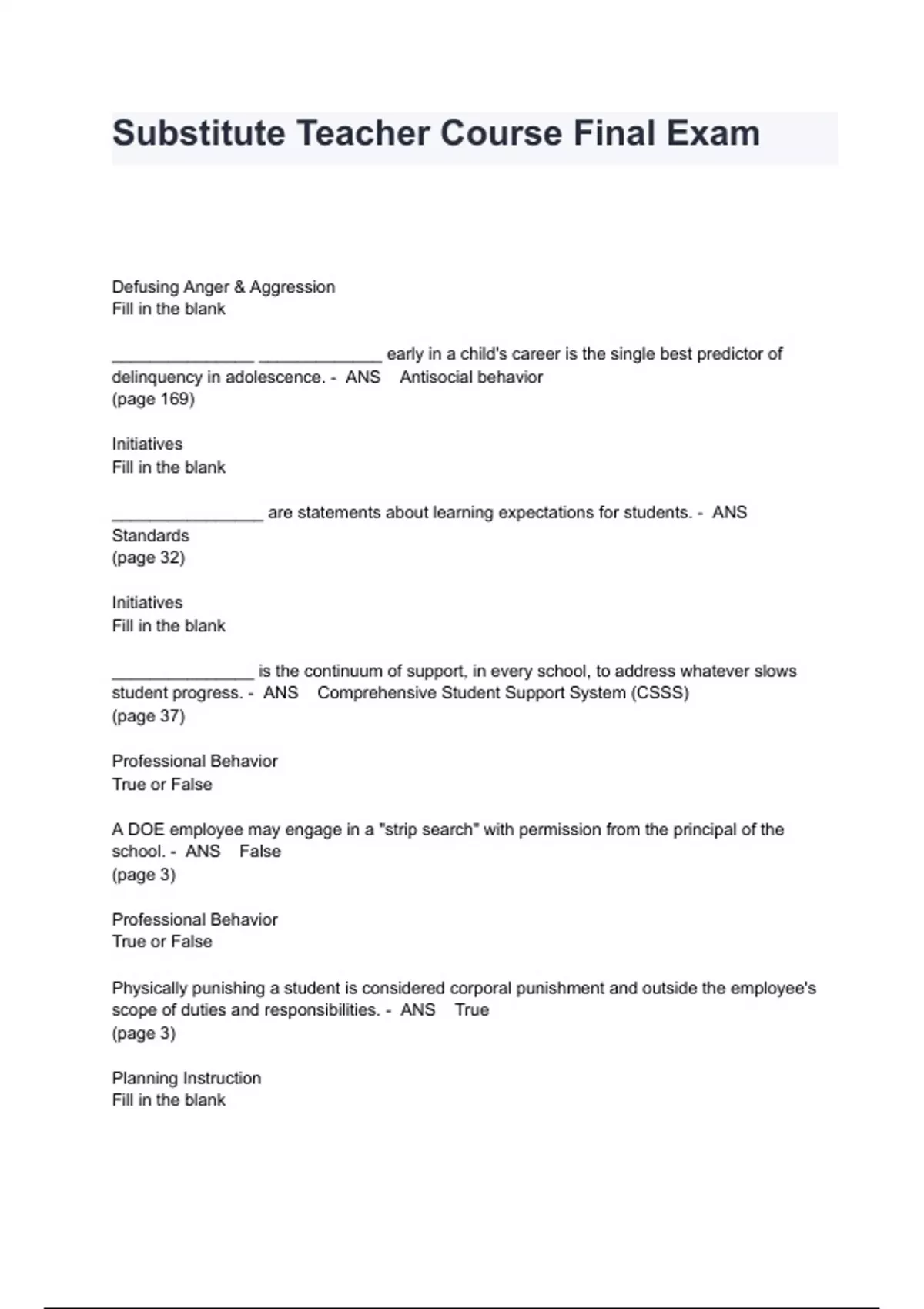 Substitute Teacher Course Final Exam Questions And Answers Defusing Anger & Aggression Fill in the blank _______________ _____________ early in a child's career is the single best predictor of delinquency in adolescence. - ANS Antisocial behavior (page 169) Initiatives Fill in the blank ________________ are statements about learning expectations for students. - ANS Standards (page 32) Initiatives Fill in the blank _______________ is the continuum of support, in every school, to address whatever slows student progress. - ANS Comprehensive Student Support System (CSSS) (page 37) Professional Behavior True or False A DOE employee may engage in a "strip search" with permission from the principal of the school. - ANS False (page 3) Professional Behavior True or False Physically punishing a student is considered corporal punishment and outside the employee's scope of duties and responsibilities. - ANS True (page 3) Planning Instruction Fill in the blank