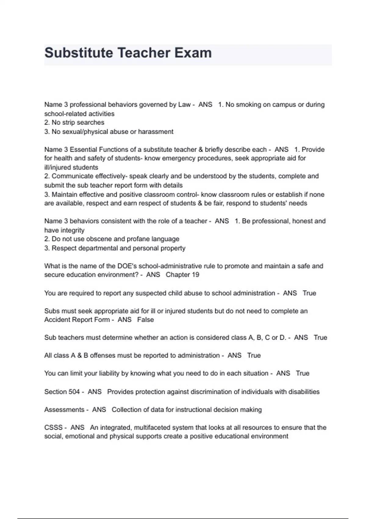 Substitute Teacher Exam Questions And Answers Name 3 professional behaviors governed by Law - ANS 1. No smoking on campus or during school-related activities 2. No strip searches 3. No sexual/physical abuse or harassment Name 3 Essential Functions of a substitute teacher & briefly describe each - ANS 1. Provide for health and safety of students- know emergency procedures, seek appropriate aid for ill/injured students 2. Communicate effectively- speak clearly and be understood by the students, complete and submit the sub teacher report form with details 3. Maintain effective and positive classroom control- know classroom rules or establish if none are available, respect and earn respect of students & be fair, respond to students' needs Name 3 behaviors consistent with the role of a teacher - ANS 1. Be professional, honest and have integrity 2. Do not use obscene and profane language 3. Respect departmental and personal property What is the name of the DOE's school-administrative rule to promote and maintain a safe and secure education environment? - ANS Chapter 19 You are required to report any suspected child abuse to school administration - ANS True Subs must seek appropriate aid for ill or injured students but do not need to complete an Accident Report Form - ANS False Sub teachers must determine whether an action is considered class A, B, C or D. - ANS True All class A & B offenses must be reported to administration - ANS True You can limit your liability by knowing what you need to do in each situation - ANS True Section 504 - ANS Provides protection against discrimination of individuals with disabilities Assessments - ANS Collection of data for instructional decision making