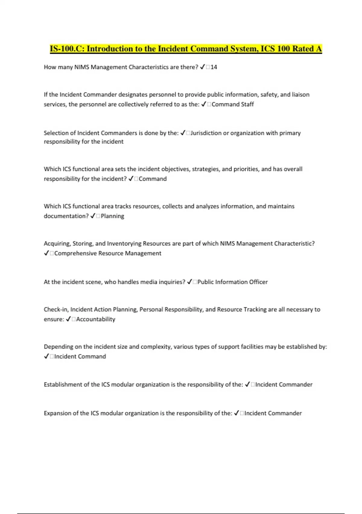 IS-100.C: Introduction to the Incident Command System, ICS 100 Rated A How many NIMS Management Characteristics are there? ️14 If the Incident Commander designates personnel to provide public information, safety, and liaison services, the personnel are collectively referred to as the: ️Command Staff Selection of Incident Commanders is done by the: ️Jurisdiction or organization with primary responsibility for the incident Which ICS functional area sets the incident objectives, strategies, and priorities, and has overall responsibility for the incident? ️Command Which ICS functional area tracks resources, collects and analyzes information, and maintains documentation? ️Planning Acquiring, Storing, and Inventorying Resources are part of which NIMS Management Characteristic? ️Comprehensive Resource Management At the incident scene, who handles media inquiries? ️Public Information Officer Check-in, Incident Action Planning, Personal Responsibility, and Resource Tracking are all necessary to ensure: ️Accountability Depending on the incident size and complexity, various types of support facilities may be established by: ️Incident Command Establishment of the ICS modular organization is the responsibility of the: ️Incident Commander Expansion of the ICS modular organization is the responsibility of the: ️Incident Commander If the Incident Commander designates personnel to provide public information, safety, and liaison services, the personnel are collectively referred to as the: ️Command Staff In a Unified Command, members representing multiple jurisdictions and agencies work together to establish: ️Incident Objectives Incident objectives that drive incident operations are established by the: ️Incident Commander or Unified Command Major activities of the Planning Section include: ️Preparing and documenting Incident Action Plans. One of the benefits of ICS is that it provides an orderly, systematic ___________ process. ️Planning Qualification, Certification, and Credentialing Personnel are part of which NIMS Management Characteristic? ️Comprehensive Resource Management Selection of Incident Commanders is done by the: ️Jurisdiction or organization with primary responsibility for the incident The Incident Command System (ICS) is: ️A standardized approach to incident management that is applicable for use in all hazards. The Incident Commander or Unified Command establishes incident objectives that include: ️Identifying strategies, tactics, tasks, and activities to achieve the objectives. The Liaison Officer: ️Is the point of contact for other response organizations. The NIMS Management Characteristic of Chain of Command and Unity of Command means tha