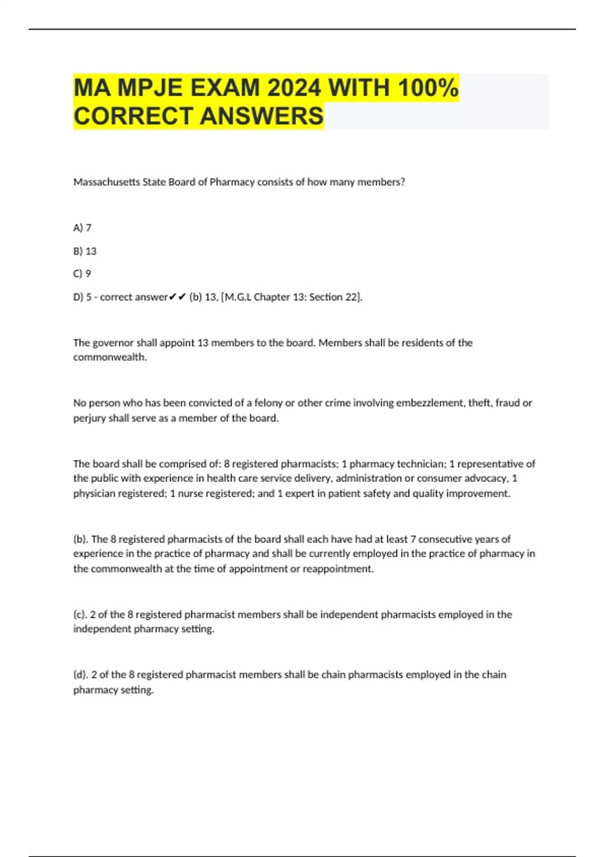 Massachusetts State Board of Pharmacy consists of how many members? A) 7 B) 13 C) 9 D) 5 - correct answer (b) 13, [M.G.L Chapter 13: Section 22]. The governor shall appoint 13 members to the board. Members shall be residents of the commonwealth. No person who has been convicted of a felony or other crime involving embezzlement, theft, fraud or perjury shall serve as a member of the board. The board shall be comprised of: 8 registered pharmacists; 1 pharmacy technician; 1 representative of the public with experience in health care service delivery, administration or consumer advocacy, 1 physician registered; 1 nurse registered; and 1 expert in patient safety and quality improvement. (b). The 8 registered pharmacists of the board shall each have had at least 7 consecutive years of experience in the practice of pharmacy and shall be currently employed in the practice of pharmacy in the commonwealth at the time of appointment or reappointment. (c). 2 of the 8 registered pharmacist members shall be independent pharmacists employed in the independent pharmacy setting. (d). 2 of the 8 registered pharmacist members shall be chain pharmacists employed in the chain pharmacy setting. (e). 1 of the 8 registered pharmacist members shall have had at least 7 years of experience in a hospital setting within the commonwealth. (f). 1 of the 8 registered pharmacist members shall have had at least 7 years of experience being employed in a long-term care pharmacy setting. (g). 1 of the 8 registered pharmacist members shall have had at least 7 years of experience in the practice of sterile compounding and shall be engaged in sterile compounding as a routine function of the member's employment. (h). 1 of the 8 registered pharmacist members shall be employed in an academic or scholarly position