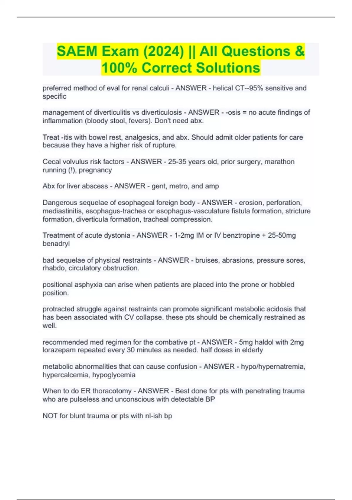 SAEM Exam (2024) || All Questions & 100% Correct Solutions SAEM Exam (2024) || All Questions & 100% Correct Solutions preferred method of eval for renal calculi - ANSWER - helical CT--95% sensitive and specific management of diverticulitis vs diverticulosis - ANSWER - -osis = no acute findings of inflammation (bloody stool, fevers). Don't need abx. Treat -itis with bowel rest, analgesics, and abx. Should admit older patients for care because they have a higher risk of rupture. Cecal volvulus risk factors - ANSWER - 25-35 years old, prior surgery, marathon running (!), pregnancy Abx for liver abscess - ANSWER - gent, metro, and amp Dangerous sequelae of esophageal foreign body - ANSWER - erosion, perforation, mediastinitis, esophagus-trachea or esophagus-vasculature fistula formation, stricture formation, diverticula formation, tracheal compression. Treatment of acute dystonia - ANSWER - 1-2mg IM or IV benztropine + 25-50mg benadryl bad sequelae of physical restraints - ANSWER - bruises, abrasions, pressure sores, rhabdo, circulatory obstruction. positional asphyxia can arise when patients are placed into the prone or hobbled position. protracted struggle against restraints can promote significant metabolic acidosis that has been associated with CV collapse. these pts should be chemically restrained as well. recommended med regimen for the combative pt - ANSWER - 5mg haldol with 2mg lorazepam repeated every 30 minutes as needed. half doses in elderly metabolic abnormalities that can cause confusion - ANSWER - hypo/hypernatremia, hypercalcemia, hypoglycemia When to do ER thoracotomy - ANSWER - Best done for pts with penetrating trauma who are pulseless and unconscious with detectable BP NOT for blunt trauma or pts with nl-ish bp old pt falls and has external hip rotation--what did they break? - ANSWER - femoral neck fx old pt falls and has internal hip rotation--what did they injure? - ANSWER - dislocated hip