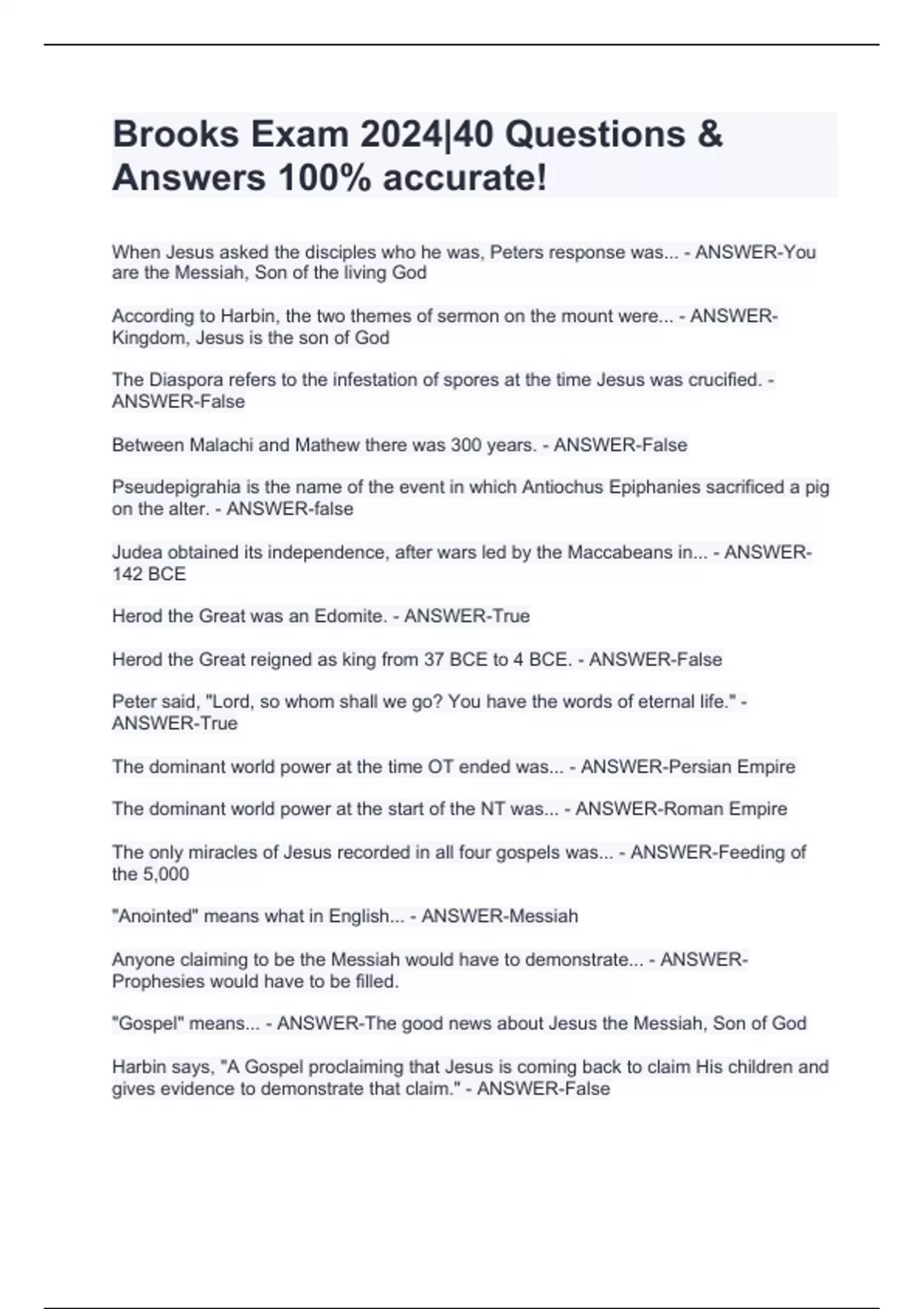 When Jesus asked the disciples who he was, Peters response was... - ANSWER-You are the Messiah, Son of the living God According to Harbin, the two themes of sermon on the mount were... - ANSWER-Kingdom, Jesus is the son of God The Diaspora refers to the infestation of spores at the time Jesus was crucified. - ANSWER-False Between Malachi and Mathew there was 300 years. - ANSWER-False Pseudepigrahia is the name of the event in which Antiochus Epiphanies sacrificed a pig on the alter. - ANSWER-false Judea obtained its independence, after wars led by the Maccabeans in... - ANSWER-142 BCE Herod the Great was an Edomite. - ANSWER-True Herod the Great reigned as king from 37 BCE to 4 BCE. - ANSWER-False Peter said, "Lord, so whom shall we go? You have the words of eternal life." - ANSWER-True The dominant world power at the time OT ended was... - ANSWER-Persian Empire The dominant world power at the start of the NT was... - ANSWER-Roman Empire The only miracles of Jesus recorded in all four gospels was... - ANSWER-Feeding of the 5,000 "Anointed" means what in English... - ANSWER-Messiah Anyone claiming to be the Messiah would have to demonstrate... - ANSWER-Prophesies would have to be filled. "Gospel" means... - ANSWER-The good news about Jesus the Messiah, Son of God Harbin says, "A Gospel proclaiming that Jesus is coming back to claim His children and gives evidence to demonstrate that claim." - ANSWER-False