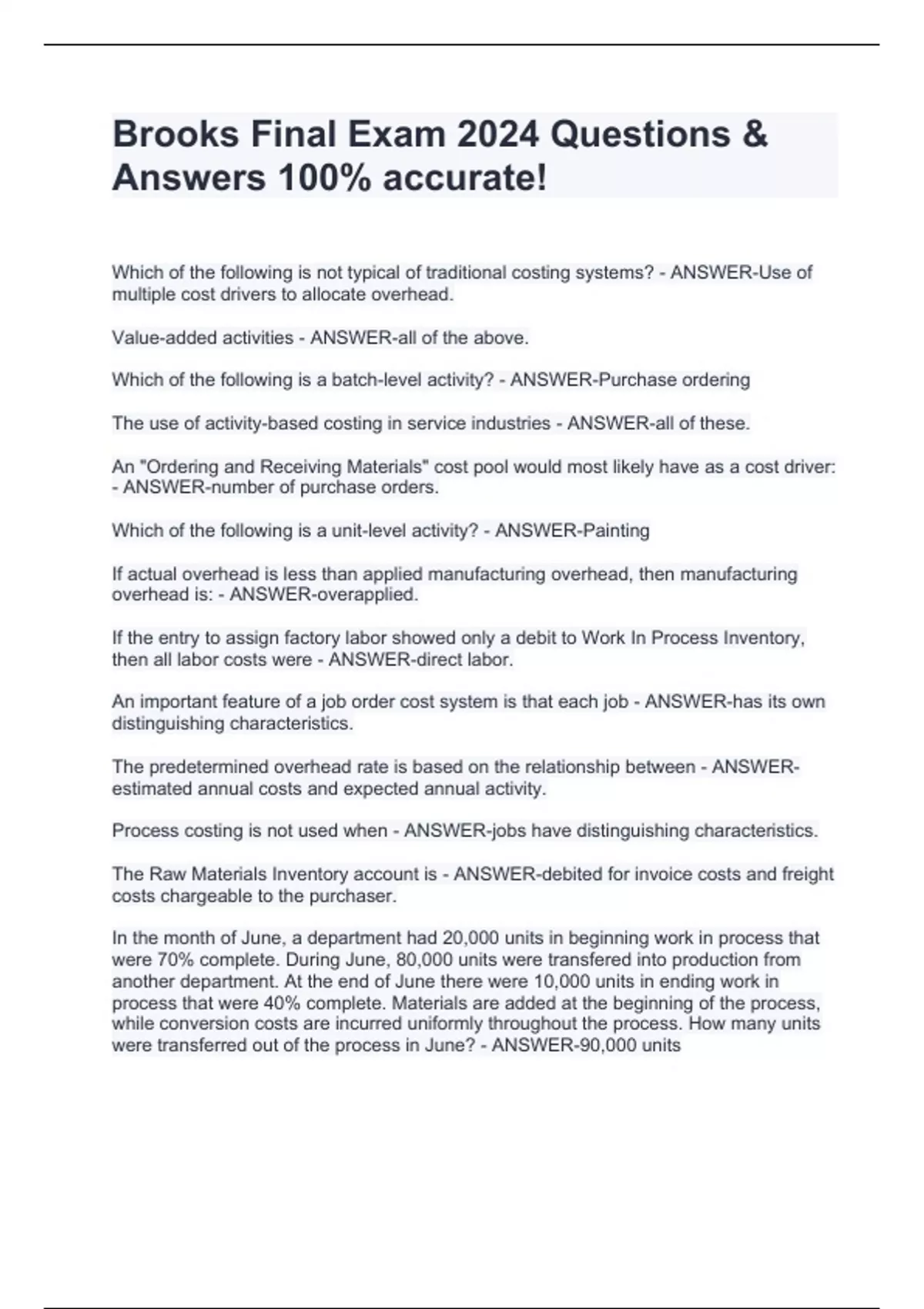 Which of the following is not typical of traditional costing systems? - ANSWER-Use of multiple cost drivers to allocate overhead. Value-added activities - ANSWER-all of the above. Which of the following is a batch-level activity? - ANSWER-Purchase ordering The use of activity-based costing in service industries - ANSWER-all of these. An "Ordering and Receiving Materials" cost pool would most likely have as a cost driver: - ANSWER-number of purchase orders. Which of the following is a unit-level activity? - ANSWER-Painting If actual overhead is less than applied manufacturing overhead, then manufacturing overhead is: - ANSWER-overapplied. If the entry to assign factory labor showed only a debit to Work In Process Inventory, then all labor costs were - ANSWER-direct labor. An important feature of a job order cost system is that each job - ANSWER-has its own distinguishing characteristics. The predetermined overhead rate is based on the relationship between - ANSWER-estimated annual costs and expected annual activity. Process costing is not used when - ANSWER-jobs have distinguishing characteristics. The Raw Materials Inventory account is - ANSWER-debited for invoice costs and freight costs chargeable to the purchaser. In the month of June, a department had 20,000 units in beginning work in process that were 70% complete. During June, 80,000 units were transfered into production from another department. At the end of June there were 10,000 units in ending work in process that were 40% complete. Materials are added at the beginning of the process, while conversion costs are incurred uniformly throughout the process. How many units were transferred out of the process in June? - ANSWER-90,000 units Materials costs of $800,000 and conversion costs of $1,020,000 were charged to a