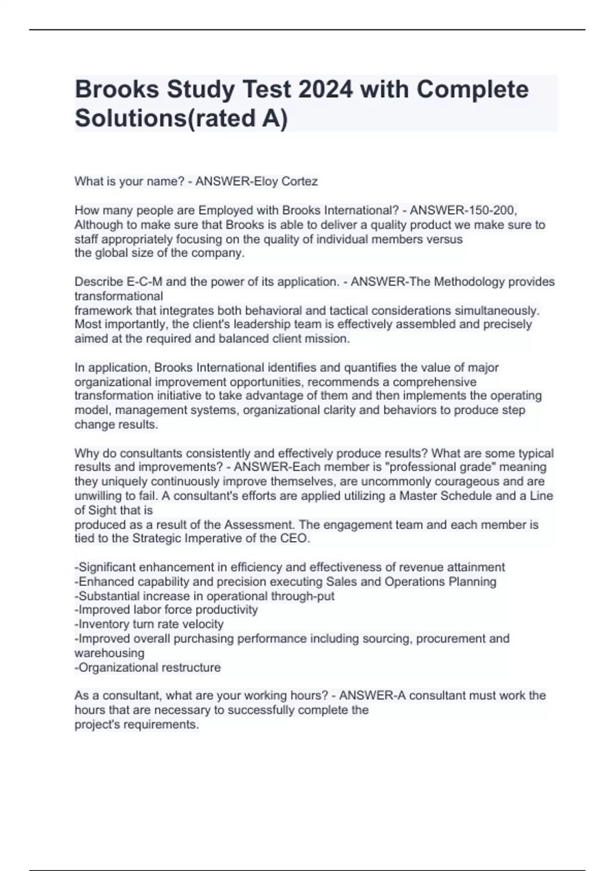 What is your name? - ANSWER-Eloy Cortez How many people are Employed with Brooks International? - ANSWER-150-200, Although to make sure that Brooks is able to deliver a quality product we make sure to staff appropriately focusing on the quality of individual members versus the global size of the company. Describe E-C-M and the power of its application. - ANSWER-The Methodology provides transformational framework that integrates both behavioral and tactical considerations simultaneously. Most importantly, the client's leadership team is effectively assembled and precisely aimed at the required and balanced client mission. In application, Brooks International identifies and quantifies the value of major organizational improvement opportunities, recommends a comprehensive transformation initiative to take advantage of them and then implements the operating model, management systems, organizational clarity and behaviors to produce step change results. Why do consultants consistently and effectively produce results? What are some typical results and improvements? - ANSWER-Each member is "professional grade" meaning they uniquely continuously improve themselves, are uncommonly courageous and are unwilling to fail. A consultant's efforts are applied utilizing a Master Schedule and a Line of Sight that is produced as a result of the Assessment. The engagement team and each member is tied to the Strategic Imperative of the CEO. -Significant enhancement in efficiency and effectiveness of revenue attainment -Enhanced capability and precision executing Sales and Operations Planning -Substantial increase in operational through-put -Improved labor force productivity -Inventory turn rate velocity -Improved overall purchasing performance including sourcing, procurement and warehousing -Organizational restructure As a consultant, what are your working hours? - ANSWER-A consultant must work the hours that are necessary to successfully complete the project's requirements. -In addition, managing the client "optics" is a critical requirement. The consultant's
