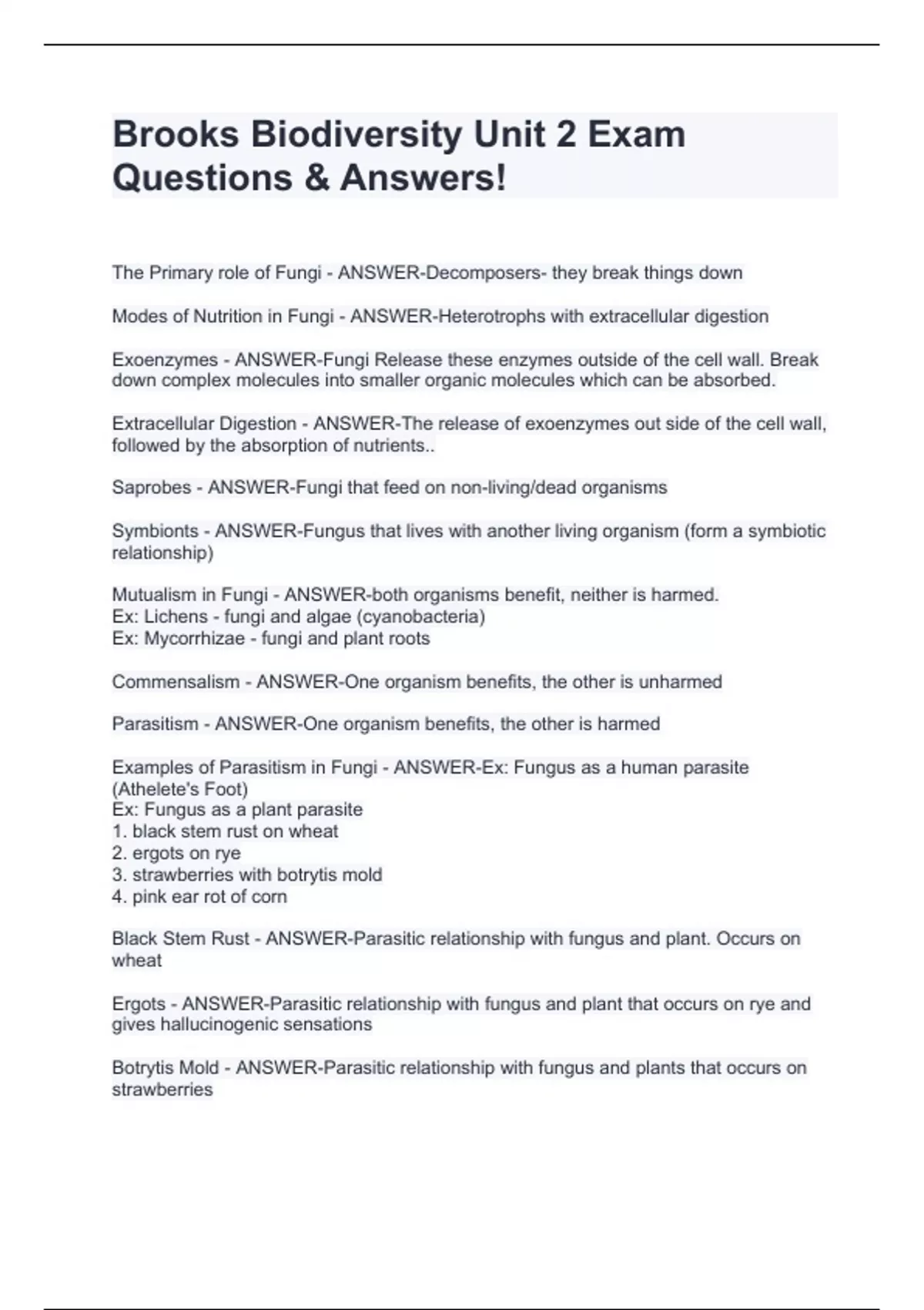 The Primary role of Fungi - ANSWER-Decomposers- they break things down Modes of Nutrition in Fungi - ANSWER-Heterotrophs with extracellular digestion Exoenzymes - ANSWER-Fungi Release these enzymes outside of the cell wall. Break down complex molecules into smaller organic molecules which can be absorbed. Extracellular Digestion - ANSWER-The release of exoenzymes out side of the cell wall, followed by the absorption of nutrients.. Saprobes - ANSWER-Fungi that feed on non-living/dead organisms Symbionts - ANSWER-Fungus that lives with another living organism (form a symbiotic relationship) Mutualism in Fungi - ANSWER-both organisms benefit, neither is harmed. Ex: Lichens - fungi and algae (cyanobacteria) Ex: Mycorrhizae - fungi and plant roots Commensalism - ANSWER-One organism benefits, the other is unharmed Parasitism - ANSWER-One organism benefits, the other is harmed Examples of Parasitism in Fungi - ANSWER-Ex: Fungus as a human parasite (Athelete's Foot) Ex: Fungus as a plant parasite 1. black stem rust on wheat 2. ergots on rye 3. strawberries with botrytis mold 4. pink ear rot of corn Black Stem Rust - ANSWER-Parasitic relationship with fungus and plant. Occurs on wheat Ergots - ANSWER-Parasitic relationship with fungus and plant that occurs on rye and gives hallucinogenic sensations Botrytis Mold - ANSWER-Parasitic relationship with fungus and plants that occurs on strawberries F