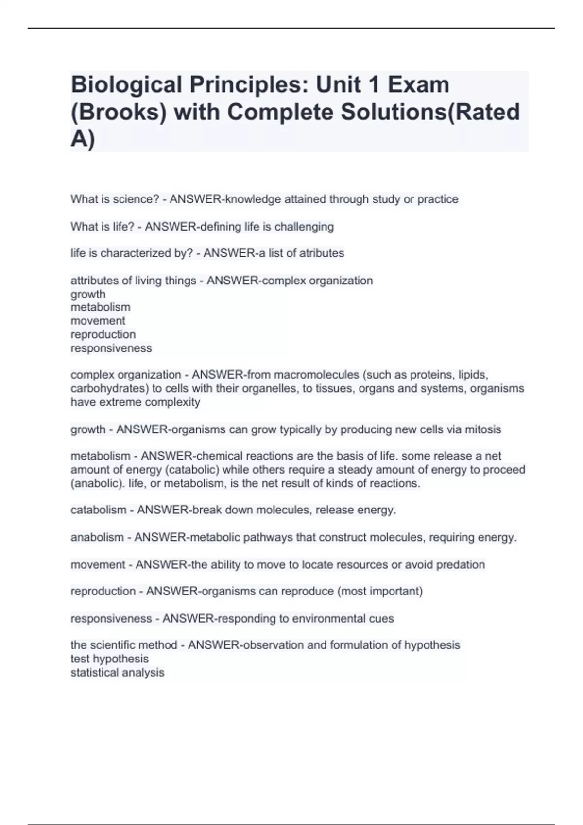 What is science? - ANSWER-knowledge attained through study or practice What is life? - ANSWER-defining life is challenging life is characterized by? - ANSWER-a list of atributes attributes of living things - ANSWER-complex organization growth metabolism movement reproduction responsiveness