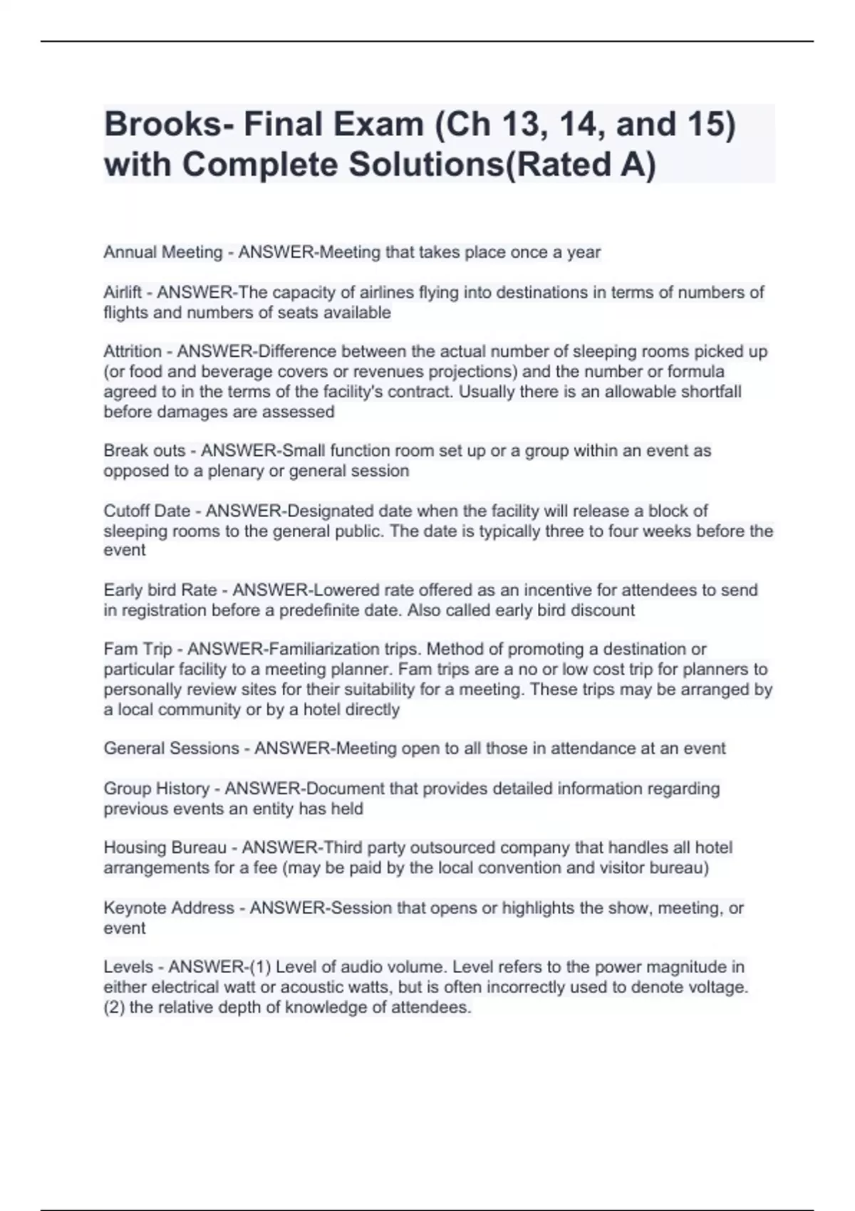 Annual Meeting - ANSWER-Meeting that takes place once a year Airlift - ANSWER-The capacity of airlines flying into destinations in terms of numbers of flights and numbers of seats available Attrition - ANSWER-Difference between the actual number of sleeping rooms picked up (or food and beverage covers or revenues projections) and the number or formula agreed to in the terms of the facility's contract. Usually there is an allowable shortfall before damages are assessed Break outs - ANSWER-Small function room set up or a group within an event as opposed to a plenary or general session Cutoff Date - ANSWER-Designated date when the facility will release a block of sleeping rooms to the general public. The date is typically three to four weeks before the event Early bird Rate - ANSWER-Lowered rate offered as an incentive for attendees to send in registration before a predefinite date. Also called early bird discount Fam Trip - ANSWER-Familiarization trips. Method of promoting a destination or particular facility to a meeting planner. Fam trips are a no or low cost trip for planners to personally review sites for their suitability for a meeting. These trips may be arranged by a local community or by a hotel directly General Sessions - ANSWER-Meeting open to all those in attendance at an event Group History - ANSWER-Document that provides detailed information regarding previous events an entity has held Housing Bureau - ANSWER-Third party outsourced company that handles all hotel arrangements for a fee (may be paid by the local convention and visitor bureau) Keynote Address - ANSWER-Session that opens or highlights the show, meeting, or event Levels - ANSWER-(1) Level of audio volume. Level refers to the power magnitude in either electrical watt or acoustic watts, but is often incorrectly used to denote voltage. (2) the relative depth of knowledge of attendees. N