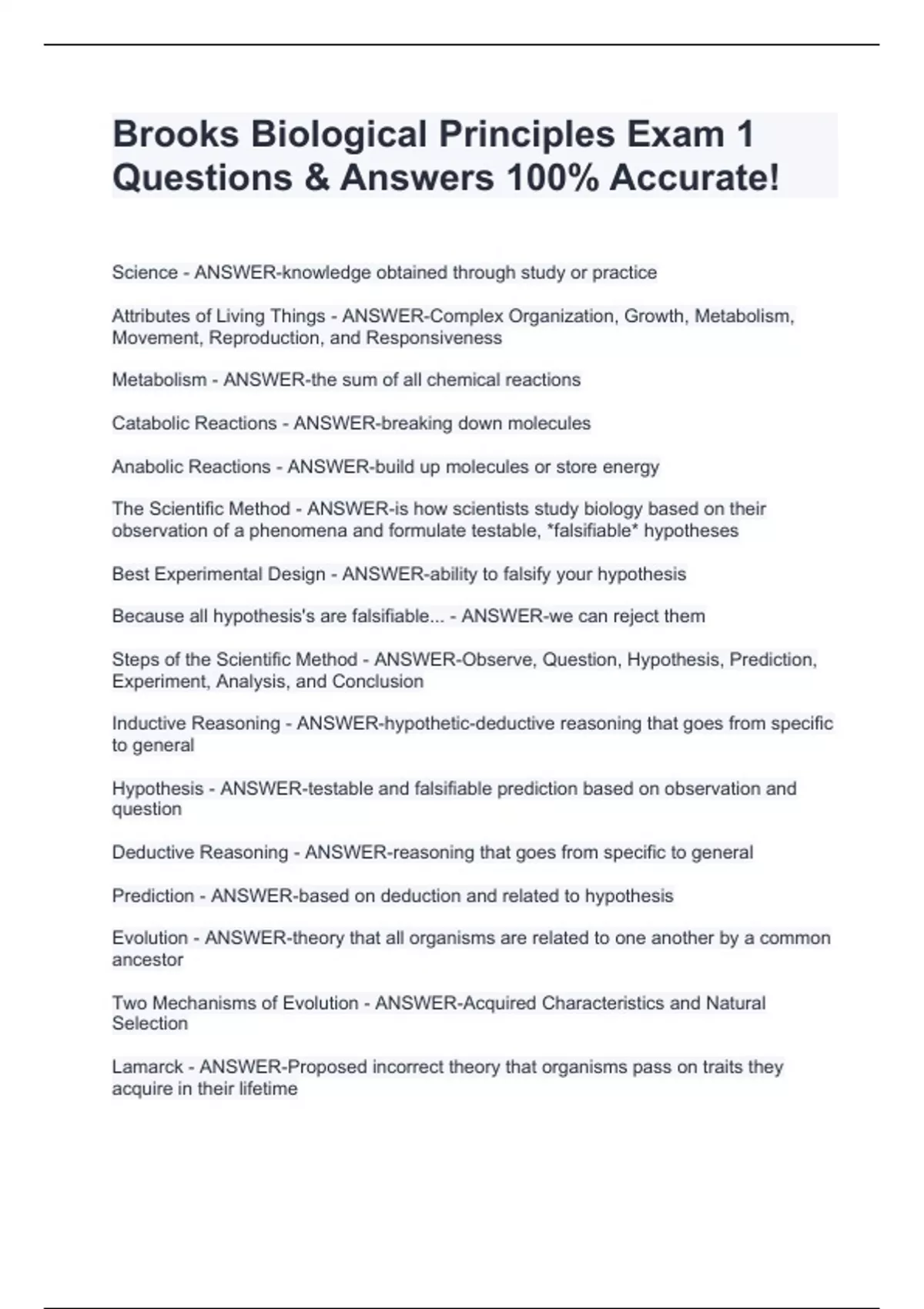 Science - ANSWER-knowledge obtained through study or practice Attributes of Living Things - ANSWER-Complex Organization, Growth, Metabolism, Movement, Reproduction, and Responsiveness Metabolism - ANSWER-the sum of all chemical reactions Catabolic Reactions - ANSWER-breaking down molecules Anabolic Reactions - ANSWER-build up molecules or store energy The Scientific Method - ANSWER-is how scientists study biology based on their observation of a phenomena and formulate testable, *falsifiable* hypotheses Best Experimental Design - ANSWER-ability to falsify your hypothesis Because all hypothesis's are falsifiable... - ANSWER-we can reject them Steps of the Scientific Method - ANSWER-Observe, Question, Hypothesis, Prediction, Experiment, Analysis, and Conclusion Inductive Reasoning - ANSWER-hypothetic-deductive reasoning that goes from specific to general Hypothesis - ANSWER-testable and falsifiable prediction based on observation and question Deductive Reasoning - ANSWER-reasoning that goes from specific to general Prediction - ANSWER-based on deduction and related to hypothesis Evolution - ANSWER-theory that all organisms are related to one another by a common ancestor Two Mechanisms of Evolution - ANSWER-Acquired Characteristics and Natural Selection Lamarck - ANSWER-Proposed incorrect theory that organisms pass on traits they acquire in their lifetime