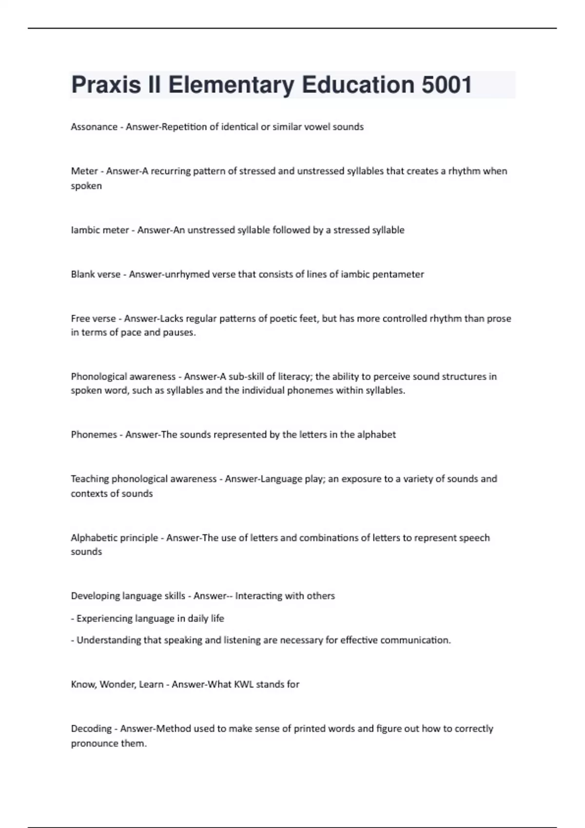 Assonance - Answer-Repetition of identical or similar vowel sounds Meter - Answer-A recurring pattern of stressed and unstressed syllables that creates a rhythm when spoken Iambic meter - Answer-An unstressed syllable followed by a stressed syllable Blank verse - Answer-unrhymed verse that consists of lines of iambic pentameter Free verse - Answer-Lacks regular patterns of poetic feet, but has more controlled rhythm than prose in terms of pace and pauses. Phonological awareness - Answer-A sub-skill of literacy; the ability to perceive sound structures in spoken word, such as syllables and the individual phonemes within syllables. Phonemes - Answer-The sounds represented by the letters in the alphabet Teaching phonological awareness - Answer-Language play; an exposure to a variety of sounds and contexts of sounds Alphabetic principle - Answer-The use of letters and combinations of letters to represent speech sounds Developing language skills - Answer-- Interacting with others - Experiencing language in daily life - Understanding that speaking and listening are necessary for effective communication. Know, Wonder, Learn - Answer-What KWL stands for Decoding - Answer-Method used to make sense of printed words and figure out how to correctly pronounce them.Student must know the relationships between letters and sounds, including: - letter patterns - words are constructed from phonemes - printed word represents a word that can be spoken. Phonics - Answer-Process of learning to read by learning how spoken language is represented by letters Whole language approach - Answer-Method of teaching children to read by recognizing words as whole pieces of language; believes that language should not be broken down into letters and combinations of letters and "decoded." Fluency - Answer-The goal of literacy development; the ability to read and write accurately and quickly