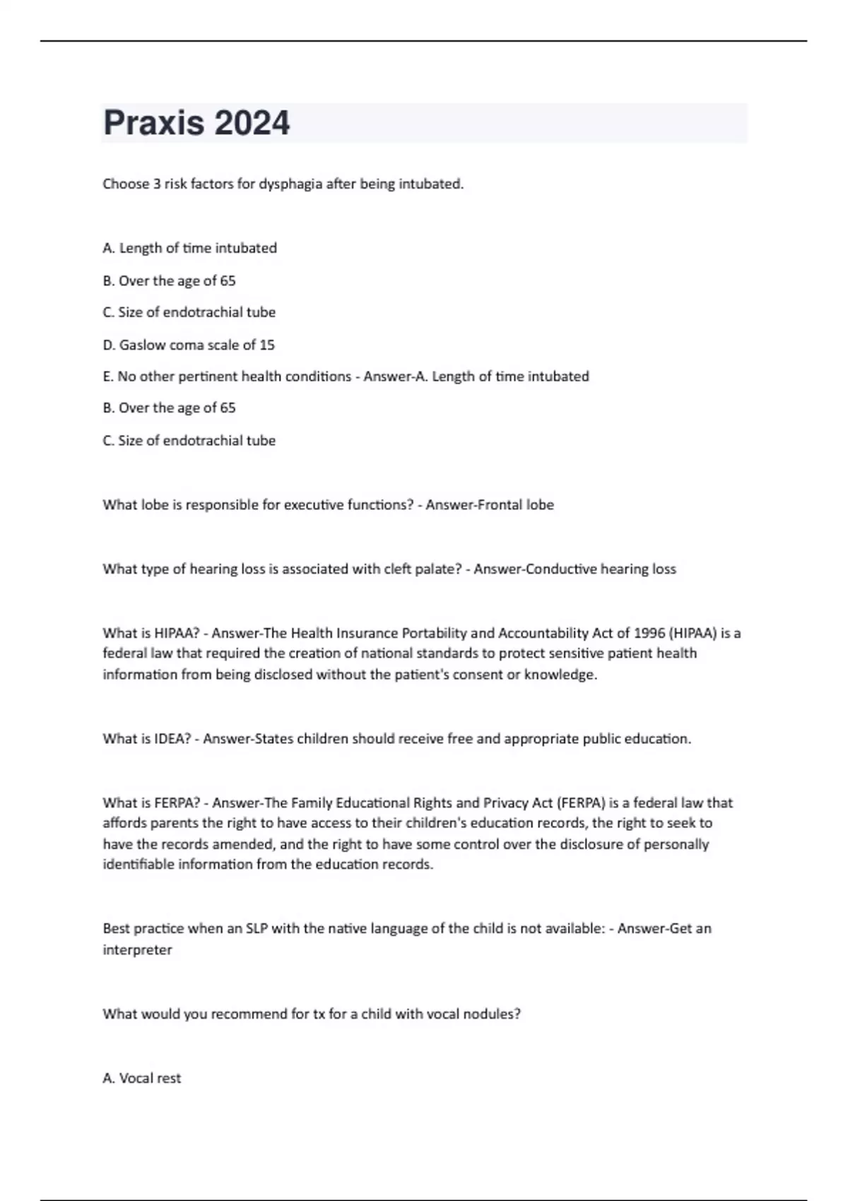 Choose 3 risk factors for dysphagia after being intubated. A. Length of time intubated B. Over the age of 65 C. Size of endotrachial tube D. Gaslow coma scale of 15 E. No other pertinent health conditions - Answer-A. Length of time intubated B. Over the age of 65 C. Size of endotrachial tube What lobe is responsible for executive functions? - Answer-Frontal lobe What type of hearing loss is associated with cleft palate? - Answer-Conductive hearing loss What is HIPAA? - Answer-The Health Insurance Portability and Accountability Act of 1996 (HIPAA) is a federal law that required the creation of national standards to protect sensitive patient health information from being disclosed without the patient's consent or knowledge. What is IDEA? - Answer-States children should receive free and appropriate public education. What is FERPA? - Answer-The Family Educational Rights and Privacy Act (FERPA) is a federal law that affords parents the right to have access to their children's education records, the right to seek to have the records amended, and the right to have some control over the disclosure of personally identifiable information from the education records. Best practice when an SLP with the native language of the child is not available: - Answer-Get an interpreter What would you recommend for tx for a child with vocal nodules? A. Vocal restB. Surgery C. Indirect voice therapy via vocal hygiene & hydration D. Direct voice therapy to reduce phonotrauma - Answer-D. Direct voice therapy to reduce phonotrauma A dad is worried about his child because spasmodic dysphonia runs in the family. What are early warning signs of spasmodic dysphonia? A. Periodic aphonia B. Swallowing difficulties - Answer-A. Periodic aphonia Which is consistent with Van Riper's approach to stuttering? A. Stuttering voluntarily (desensitization phase) B. Fluency shaping strategies - Answer-A. Stuttering voluntarily (desensitization phase)