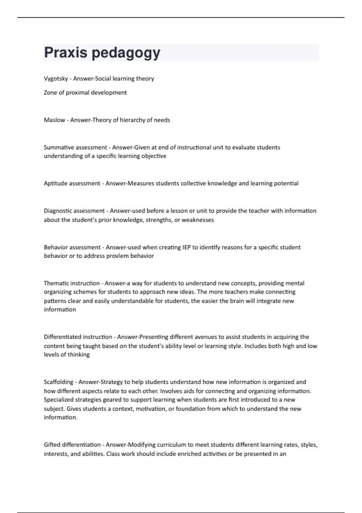 Vygotsky - Answer-Social learning theory Zone of proximal development Maslow - Answer-Theory of hierarchy of needs Summative assessment - Answer-Given at end of instructional unit to evaluate students understanding of a specific learning objective Aptitude assessment - Answer-Measures students collective knowledge and learning potential Diagnostic assessment - Answer-used before a lesson or unit to provide the teacher with information about the student's prior knowledge, strengths, or weaknesses Behavior assessment - Answer-used when creating IEP to identify reasons for a specific student behavior or to address provlem behavior Thematic instruction - Answer-a way for students to understand new concepts, providing mental organizing schemes for students to approach new ideas. The more teachers make connecting patterns clear and easily understandable for students, the easier the brain will integrate new information Differentiated instruction - Answer-Presenting different avenues to assist students in acquiring the content being taught based on the student's ability level or learning style. Includes both high and low levels of thinking Scaffolding - Answer-Strategy to help students understand how new information is organized and how different aspects relate to each other. Involves aids for connecting and organizing information. Specialized strategies geared to support learning when students are first introduced to a new subject. Gives students a context, motivation, or foundation from which to understand the new information. Gifted differentiation - Answer-Modifying curriculum to meet students different learning rates, styles, interests, and abilities. Class work should include enriched activities or be presented in anaccelerated way. Provide greater breadth and depth, use resources not normally available to them. Not just increased volume or more difficult work. Formative assessment - Answer-provide feedback during the instructional process to allow the teacher to adjust instruction to address student needs Norm-referenced assessment - Answer-Compares student performance to another population, such as peers who have taken the same test Criterion referenced assessment - Answer-How well a student understands specific content on a test Portfolio assessment - Answer-a collection of student work accumulated over a period of instruction, such as in a unit or course. Exhibits students efforts, progress, and achievement in one or more areas Informal assessment - Answer-Occurs in a more casual manner and may include observation, inventories, checklists, rating scales, rubrics, performance and portfolio assessments, participation, peer and self evaluation, and discussion Blooms taxonomy - Answer-divides leaning objectives into levels according to type and complexity. six levels within the cognitive domain for learning. They are: Knowledge, Comprehension, Application, Analysis, Synthesis, & Evaluation Scope - Answer-deals with the breadth of what is taught in a subject Sequence - Answer-the order in which the materials are taught Pedagogy - Answer-How instruction is carried out or the method and practice of teaching. Areas of exceptionality - Answer-visual and perceptual difficulties; special physical or sensory challenges; learning disabilities; ADD, ADHD; functional mental retardation Discovery learning - Answer-instructional strategy that enables students to induce general principles or concepts by themselves or in groups, using their own free exploration of data or experiences. The teacher does not instruct, but rather monitors student participation and serves as a resourceIndividuals with Disabilities Act (IDEA) - Answer-Federal legislation related to the education of students with disabilities. This law includes the requirement of school counselors to participate in IEP planning process and meetings. 504 - Answer-requires school district to provide FAPE for every qualified person with a disability, regardless of the nature and severity of the person's disability. Students have a written accommodation plan but not an IEP. Constructivism - Answer-learning theory that proposes that students construct understanding based on their own experiences Social learning theory - Answer-the effect of a behavior has an impact on the motivation of people to engage in that specific behavior Grade equivalent score - Answer-score that compares the raw score attained by an individual student to the raw score attained by the average student in the norm group for the particular test and then reports the grade and month level of the norm group comparison Percentile rank - Answer-percentage of students in a norm group whose scores are exceeded by any specific raw score Assertive discipline - Answer-Canter's theory in which teachers clearly communicate expectations and class rules and follow through with expectations. If students don't follow rules they face consequences, if they do they get positive recognition.