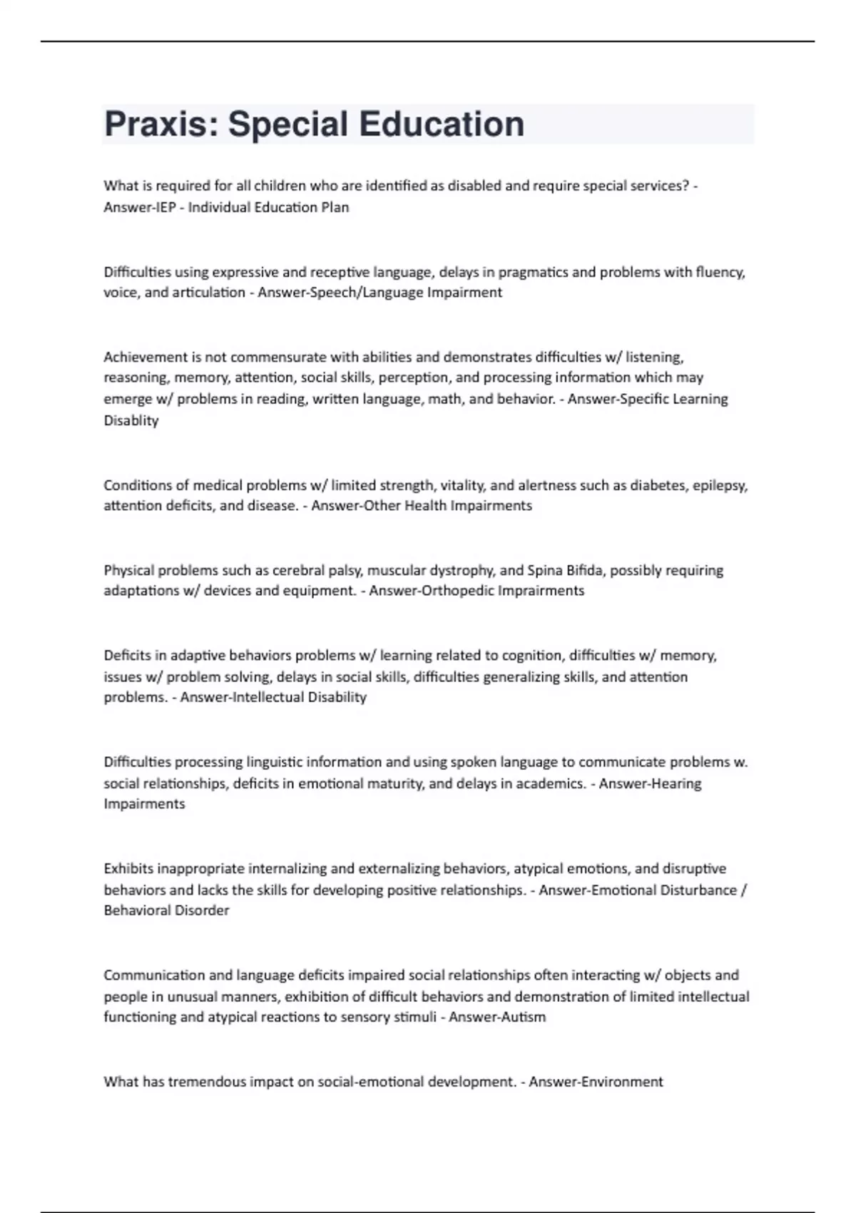 What is required for all children who are identified as disabled and require special services? - Answer-IEP - Individual Education Plan Difficulties using expressive and receptive language, delays in pragmatics and problems with fluency, voice, and articulation - Answer-Speech/Language Impairment Achievement is not commensurate with abilities and demonstrates difficulties w/ listening, reasoning, memory, attention, social skills, perception, and processing information which may emerge w/ problems in reading, written language, math, and behavior. - Answer-Specific Learning Disablity Conditions of medical problems w/ limited strength, vitality, and alertness such as diabetes, epilepsy, attention deficits, and disease. - Answer-Other Health Impairments Physical problems such as cerebral palsy, muscular dystrophy, and Spina Bifida, possibly requiring adaptations w/ devices and equipment. - Answer-Orthopedic Imprairments Deficits in adaptive behaviors problems w/ learning related to cognition, difficulties w/ memory, issues w/ problem solving, delays in social skills, difficulties generalizing skills, and attention problems. - Answer-Intellectual Disability Difficulties processing linguistic information and using spoken language to communicate problems w. social relationships, deficits in emotional maturity, and delays in academics. - Answer-Hearing Impairments Exhibits inappropriate internalizing and externalizing behaviors, atypical emotions, and disruptive behaviors and lacks the skills for developing positive relationships. - Answer-Emotional Disturbance / Behavioral Disorder Communication and language deficits impaired social relationships often interacting w/ objects and people in unusual manners, exhibition of difficult behaviors and demonstration of limited intellectual functioning and atypical reactions to sensory stimuli - Answer-Autism What has tremendous impact on social-emotional development. - Answer-EnvironmentWhat environmental factors impact social-emotional development? - Answer-Parents, Gender, Sibblings, and Individual Temperment What, other than environment, impacts social-emotional development? - Answer-Communication, Language, and Congnation What areas in life are effected by language development? - Answer-reading, listening, writning, all academic subjects, and social relationships