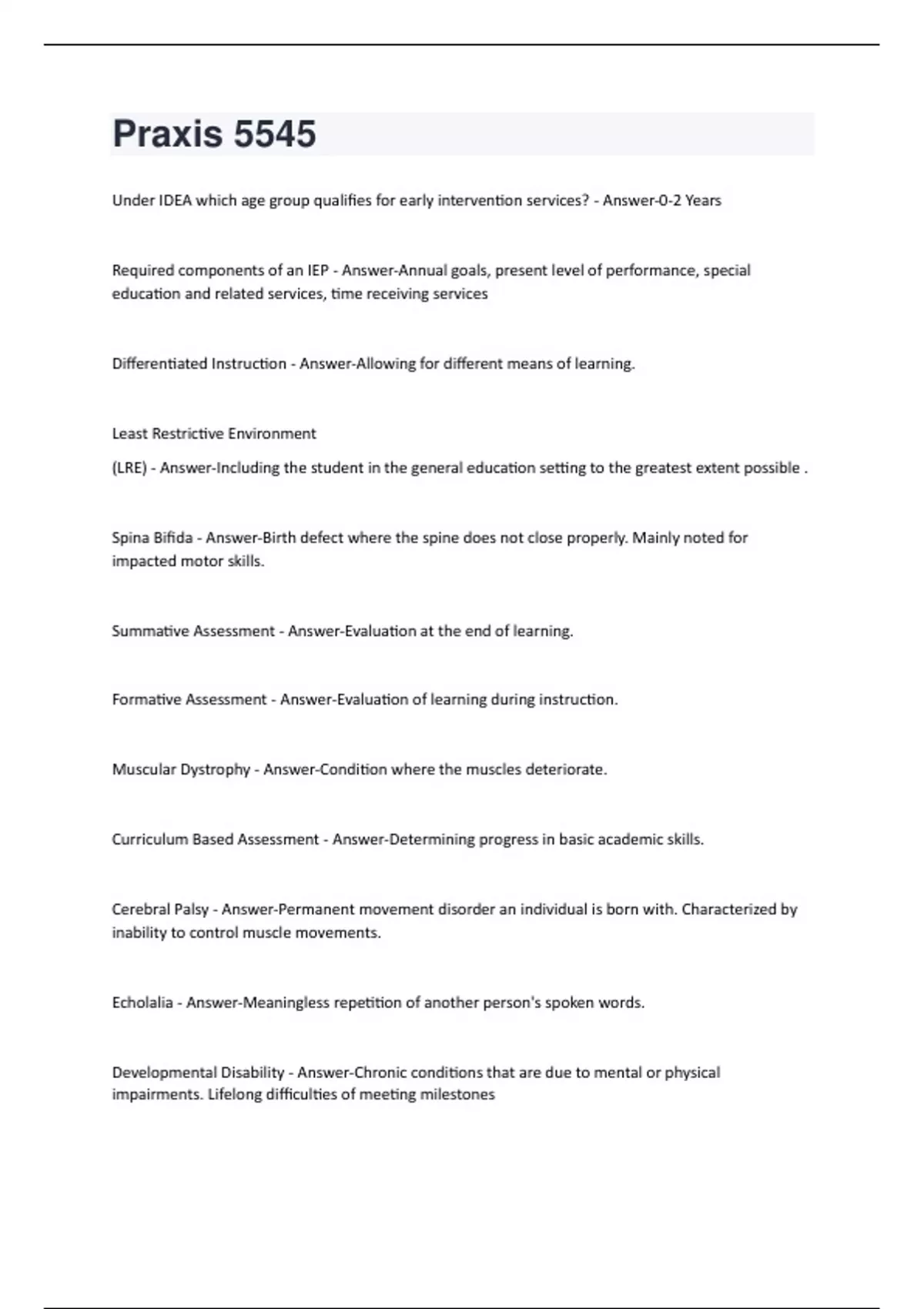 Under IDEA which age group qualifies for early intervention services? - Answer-0-2 Years Required components of an IEP - Answer-Annual goals, present level of performance, special education and related services, time receiving services Differentiated Instruction - Answer-Allowing for different means of learning. Least Restrictive Environment (LRE) - Answer-Including the student in the general education setting to the greatest extent possible . Spina Bifida - Answer-Birth defect where the spine does not close properly. Mainly noted for impacted motor skills. Summative Assessment - Answer-Evaluation at the end of learning. Formative Assessment - Answer-Evaluation of learning during instruction. Muscular Dystrophy - Answer-Condition where the muscles deteriorate. Curriculum Based Assessment - Answer-Determining progress in basic academic skills. Cerebral Palsy - Answer-Permanent movement disorder an individual is born with. Characterized by inability to control muscle movements. Echolalia - Answer-Meaningless repetition of another person's spoken words. Developmental Disability - Answer-Chronic conditions that are due to mental or physical impairments. Lifelong difficulties of meeting milestonesDevelopmental Delay - Answer-When a child is not reaching a developmental milestone (not attributed to a disability). Learned Helplessness - Answer-Learned behavior that an individual cannot complete a task due to bad experiences or help from others. What disabilities can occur with others? - Answer-SLD, ASD, some physical disabilities Components of a measurable goal - Answer-Condition, Name, Behavior, Criterion Successful Inclusion Program - Answer-Positive community, supports, collaboration, instructional supports Behavior Management Plan Behavior Intervention Plan(BIP) - Answer-Used when a student has consistent and extreme behavior problems that cannot be attributed to a disability. Used to improve behaviors. Academic Skills - Answer-Skills and knowledge related to core academics. Functional Skills - Answer-Skills and knowledge related to health, safety, social development, and others that support the success of a student. Autism - Answer-a developmental disability significantly affecting verbal and nonverbal communication and social interaction, generally evident before age three, that adversely affects a child's educational performance Traits of Autism - Answer-Unusual fixation, Inability to focus without first completing a routine, Disruptive behavior when ordinary schedule is interrupted, Unusual communication habits, Difficulty understanding social interactions, Trouble following directions, Hampered ability to communicate, Disinterest, Disruptive behavioral problems