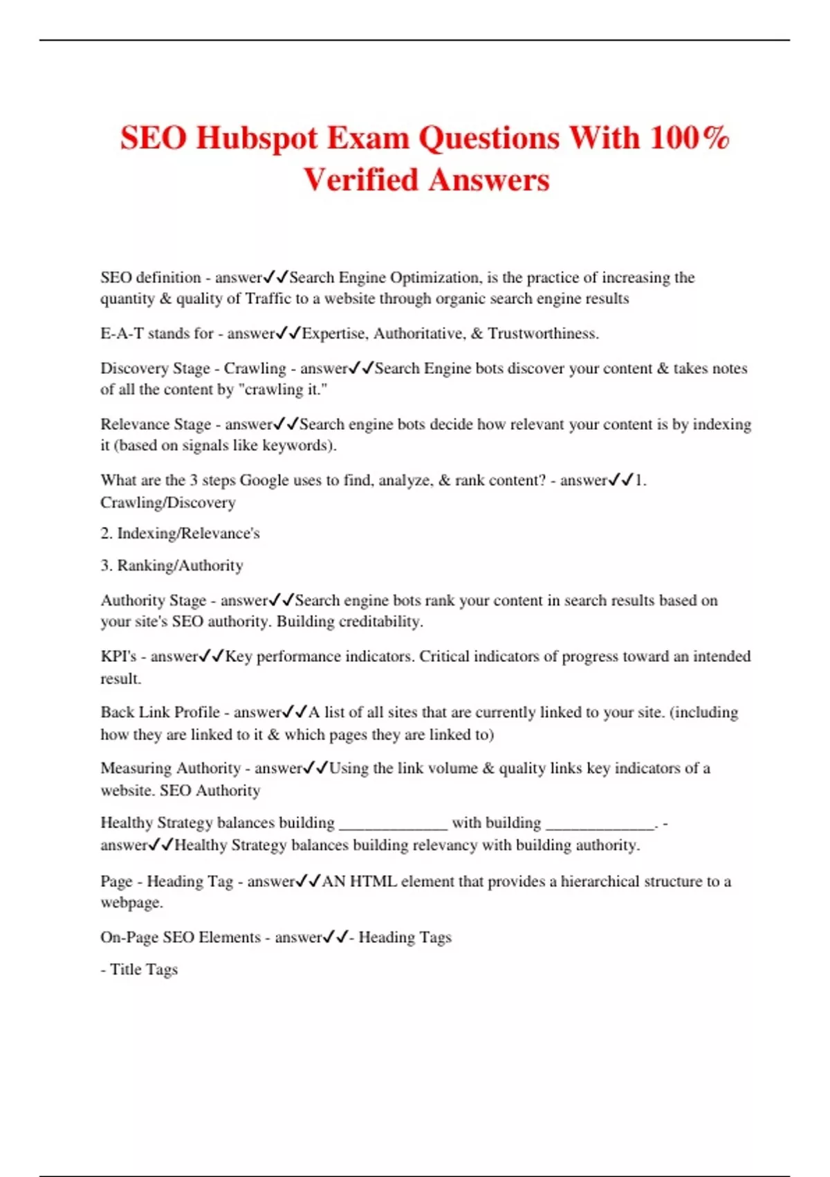 SEO Hubspot Exam Questions With 100% Verified Answers SEO definition - answerSearch Engine Optimization, is the practice of increasing the quantity & quality of Traffic to a website through organic search engine results E-A-T stands for - answerExpertise, Authoritative, & Trustworthiness. Discovery Stage - Crawling - answerSearch Engine bots discover your content & takes notes of all the content by "crawling it." Relevance Stage - answerSearch engine bots decide how relevant your content is by indexing it (based on signals like keywords). What are the 3 steps Google uses to find, analyze, & rank content? - answer1. Crawling/Discovery 2. Indexing/Relevance's 3. Ranking/Authority Authority Stage - answerSearch engine bots rank your content in search results based on your site's SEO authority. Building creditability. KPI's - answerKey performance indicators. Critical indicators of progress toward an intended result. Back Link Profile - answerA list of all sites that are currently linked to your site. (including how they are linked to it & which pages they are linked to)