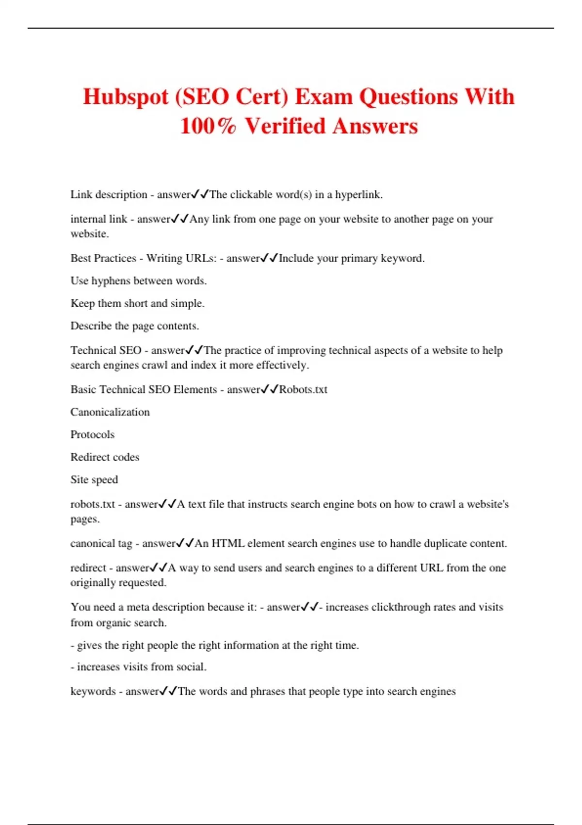 Hubspot (SEO Cert) Exam Questions With 100% Verified Answers Link description - answerThe clickable word(s) in a hyperlink. internal link - answerAny link from one page on your website to another page on your website. Best Practices - Writing URLs: - answerInclude your primary keyword. Use hyphens between words. Keep them short and simple. Describe the page contents. Technical SEO - answerThe practice of improving technical aspects of a website to help search engines crawl and index it more effectively. Basic Technical SEO Elements - answerR Canonicalization Protocols Redirect codes Site speed - answerA text file that instructs search engine bots on how to crawl a website's pages. canonical tag - answerAn HTML element search engines use to handle duplicate content. redirect - answerA way to send users and search engines to a different URL from the one originally requested. You need a meta description because it: - answer- increases clickthrough rates and visits from organic search. - gives the right people the right information at the right time. - increases visits from social. keywords - answerThe words and phrases that people type into search engines