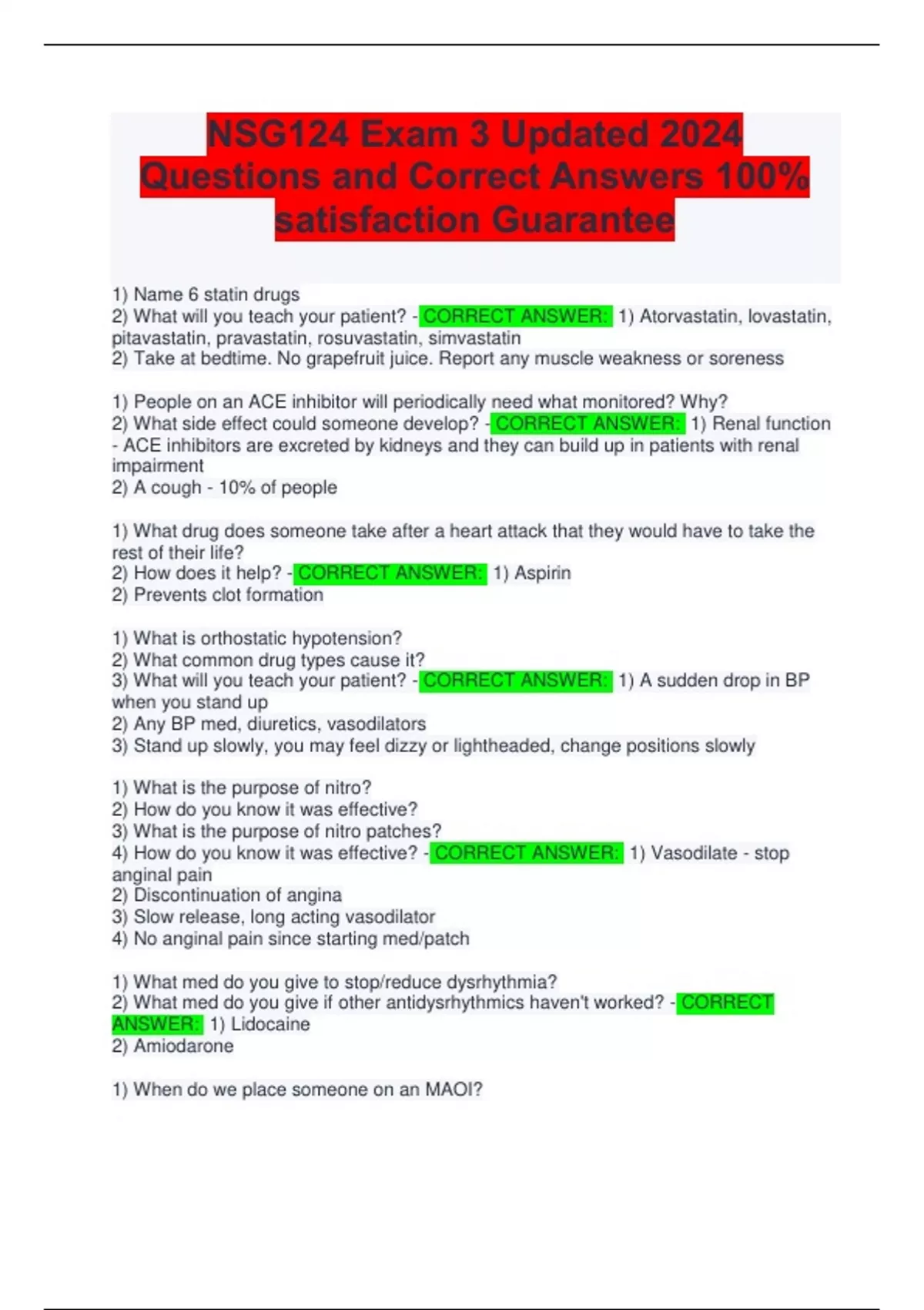 NSG124 Exam 3 Updated 2024 Questions and Correct Answers 100% satisfaction Guarantee