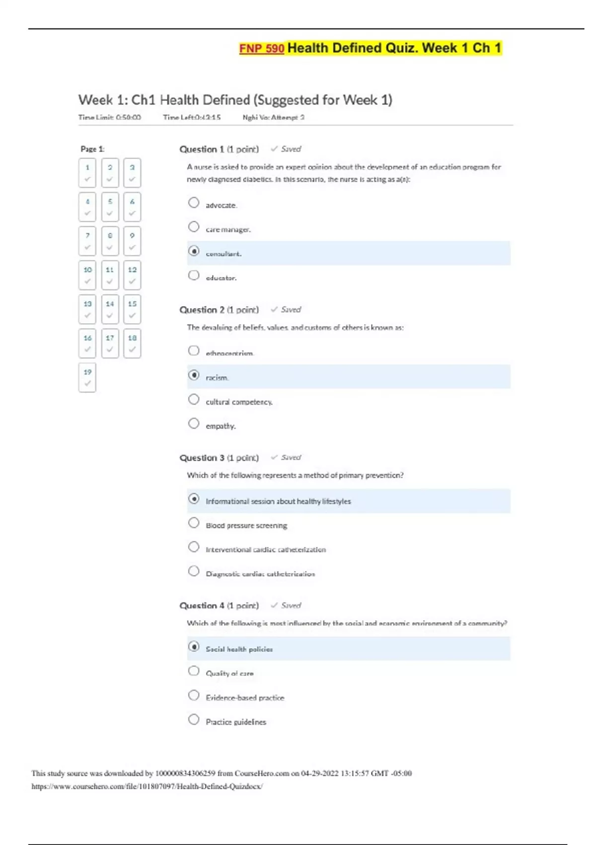 FNP 590 Health Defined Quiz. Week 1 Ch 1 This study source was downloaded by from CourseH on :15:57 GMT -05:00