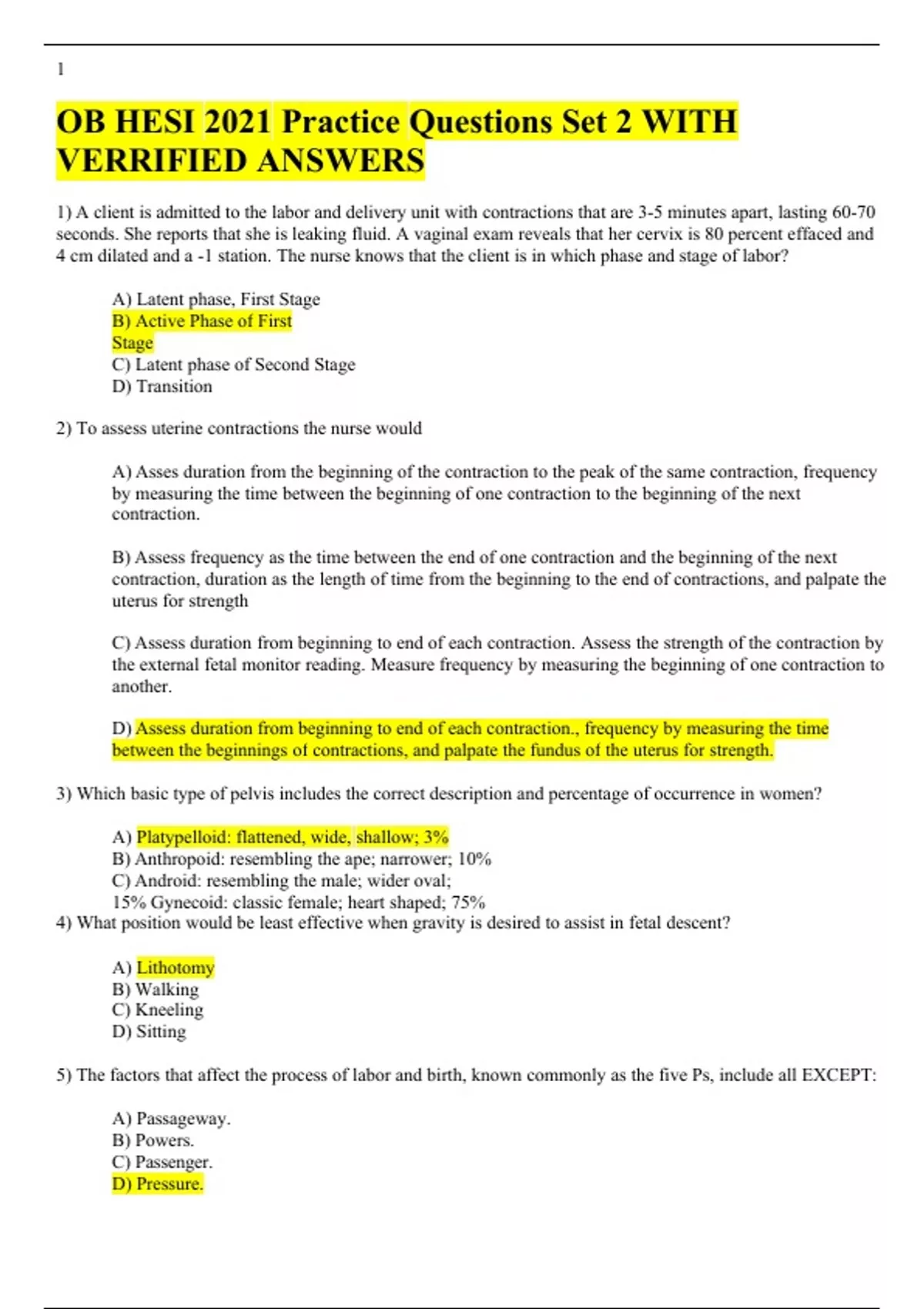 OB HESI 2021 Practice Questions Set 2 WITH VERRIFIED ANSWERS