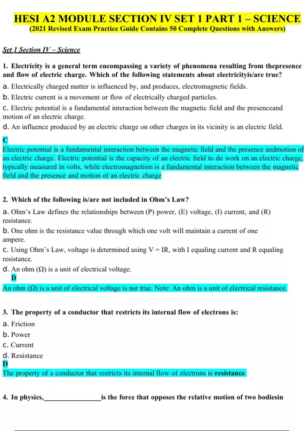 HESI A2 MODULE SECTION IV SET 1 PART 1 – SCIENCE (2021 Revised Exam Practice Guide Contains 50 Complete Questions with Answers) Set 1 Section IV – Science 1. Electricity is a general term encompassing a variety of phenomena resulting from thepresence and flow of electric charge. Which of the following statements about electricityis/are true? a. Electrically charged matter is influenced by, and produces, electromagnetic fields. b. Electric current is a movement or flow of electrically charged particles. c. Electric potential is a fundamental interaction between the magnetic field and the presenceand motion of an electric charge. d. An influence produced by an electric charge on other charges in its vicinity is an electric field. C Electric potential is a fundamental interaction between the magnetic field and the presence andmotion of an electric charge. Electric potential is the capacity of an electric field to do work on an electric charge, typically measured in volts, while electromagnetism is a fundamental interaction between the magnetic field and the presence and motion of an electric charge 2. Which of the following is/are not included in Ohm’s Law? a. Ohm’s Law defines the relationships between (P) power, (E) voltage, (I) current, and (R) resistance. b. One ohm is the resistance value through which one volt will maintain a current of one ampere. c. Using Ohm’s Law, voltage is determined using V = IR, with I equaling current and R equaling resistance. d. An ohm (Ω) is a unit of electrical voltage. D An ohm (Ω) is a unit of electrical voltage is not true. Note: An ohm is a unit of electrical resistance. 3. The property of a conductor that restricts its internal flow of electrons is: a. Friction b. Power c. Current d. Resistance D The property of a conductor that restricts its internal flow of electrons is resistance. 4. In physics, is the force that opposes the relative motion of two bodiesin contact. a. Resistance b. Abrasiveness c. Friction d. Antagonism C In physics, friction is the force that opposes the relative motion of two bodies in contact 5. What is the difference, of any, between kinetic energy and potential energy? a. Kinetic energy is the energy of a body that results from heat while potential energy is theenergy possessed by an object that is chilled b. Kinetic energy is the energy of a body that results from motion while potential energy is theenergy possessed by an object by virtue of its position or state, e.g., as in a compressed spring. c. There is no difference between kinetic and potential energy; all energy is the same. d. Potential energy is the energy of a body that results from motion while kinetic energy is theenergy possessed by an object by virtue of its position or state, e.g., as in a compressed spring. B Kinetic energy is the energy of a body that results from motion while potential energy is theenergy possessed by an object by virtue of its position or state, e.g., as in a compressed spring. 6. What are considered the four fundamental forces of nature? a. Gravity, electromagnetic force, weak nuclear force, and strong nuclear force b. Gravity, electromagnetic force, negative nuclear force, and positive nuclear force c. Polarity, electromagnetic force, weak nuclear force, and strong nuclear force d. Gravity, chemical magnetic force, weak nuclear force, and strong nuclear force A The four fundamental forces of nature are gravity, electromagnetic force, weak nuclear force,and strong nuclear force. 7. Starting with the weakest, arrange the fundamental forces of nature in order of strength. a. Gravity, Weak Nuclear Force, Electromagnetic Force, Strong Nuclear Force b. Weak Nuclear Force, Gravity, Electromagnetic Force, Strong Nuclear Force c. Strong Nuclear Force, Weak Nuclear Force, Electromagnetic Force, Gravity d. Gravity, Strong Nuclear Force, Weak Nuclear Force, Electromagnetic Force A Starting with the weakest, the fundamental forces of nature in order of strength are, Gravity,Weak nuclear force, Electromagnetic force, Strong nuclear force. Note: Although gravitational force is the weakest of the four, it acts over great distances. Electromagnetic force is of order 1039 times stronger than gravity. 8. What is the difference between Strong Nuclear Force and Weak Nuclear Force? a. The Strong Nuclear Force is an attractive force that binds protons and neutrons and maintains the structure of the nucleus, and the Weak Nuclear Force is responsible for the radioactive beta decay and other subatomic reactions. b. The Strong Nuclear Force is responsible for the radioactive beta decay and other subatomicreactions, and the Weak Nuclear Force is an attractive force that binds protons and neutrons and maintains the structure of the nucleus. c. The Weak Nuclear Force is feeble and the Strong Nuclear Force is robust. d. The Strong Nuclear Force is a negative force that releases protons and neutrons and threatens the structure of the nucleus, and the Weak Nuclear Force is an attractive force thatbinds protons and neutrons and maintains the structure of the nucleus. A The Strong Nuclear Force is an attractive force that binds protons and neutrons and maintains the structure of the nucleus, and the Weak Nuclear Force is responsible for the radioactive betadecay and other subatomic reactions. Note: The Weak Nuclear Force is so named because it is only effective for short distances. Nevertheless, it is through the Weak Nuclear Force that the sun provides us with energy by allowing one element to change into another element 9. The Law of Conservation of Mass states that: a. No detectable gain but, depending on the substances used, some loss can occur in chemicalreactions. b. No detectable gain or loss occurs in chemical reactions. c. No detectable loss but some gain occurs in chemical reactions. d. Depending on the substances used, substantial gain or loss can occur in chemical reactions. B No detectable gain or loss occurs in chemical reactions. Note: No detec