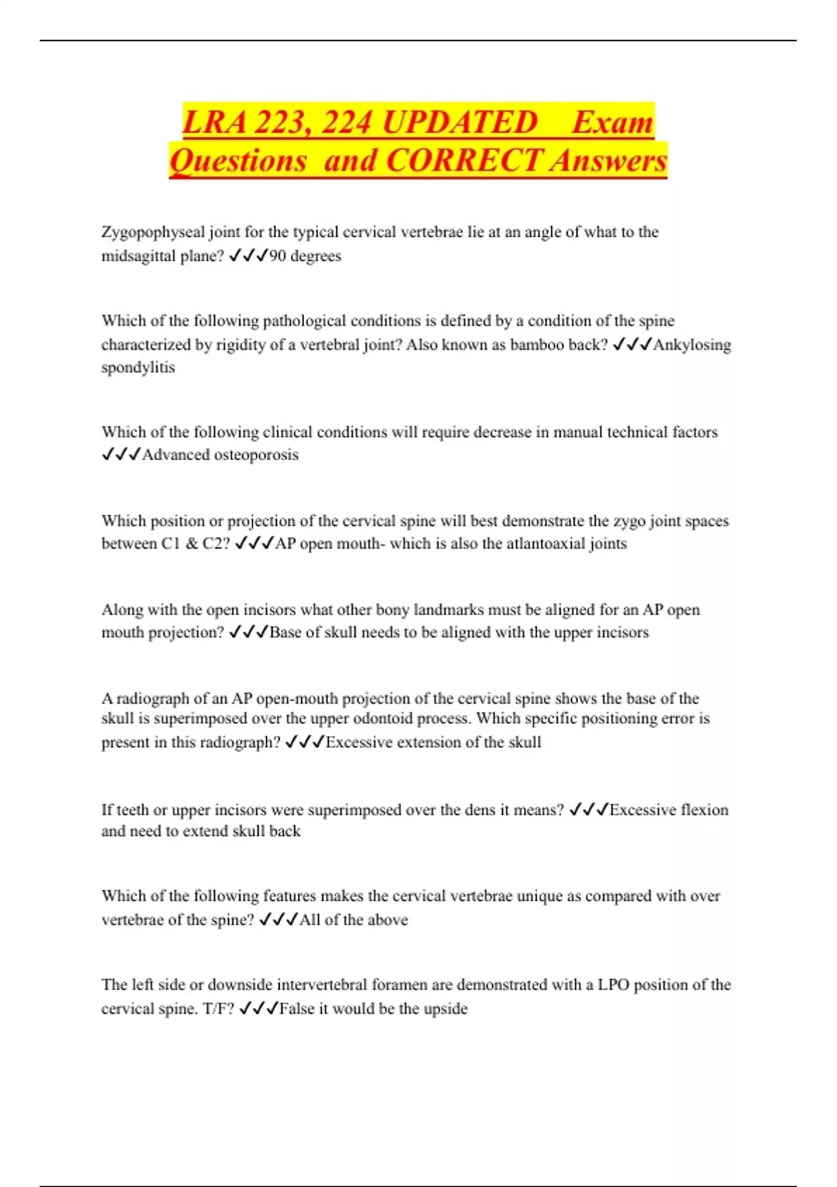 Zygopophyseal joint for the typical cervical vertebrae lie at an angle of what to the midsagittal plane? 90 degrees Which of the following pathological conditions is defined by a condition of the spine characterized by rigidity of a vertebral joint? Also known as bamboo back? Ankylosing spondylitis Which of the following clinical conditions will require decrease in manual technical factors Advanced osteoporosis